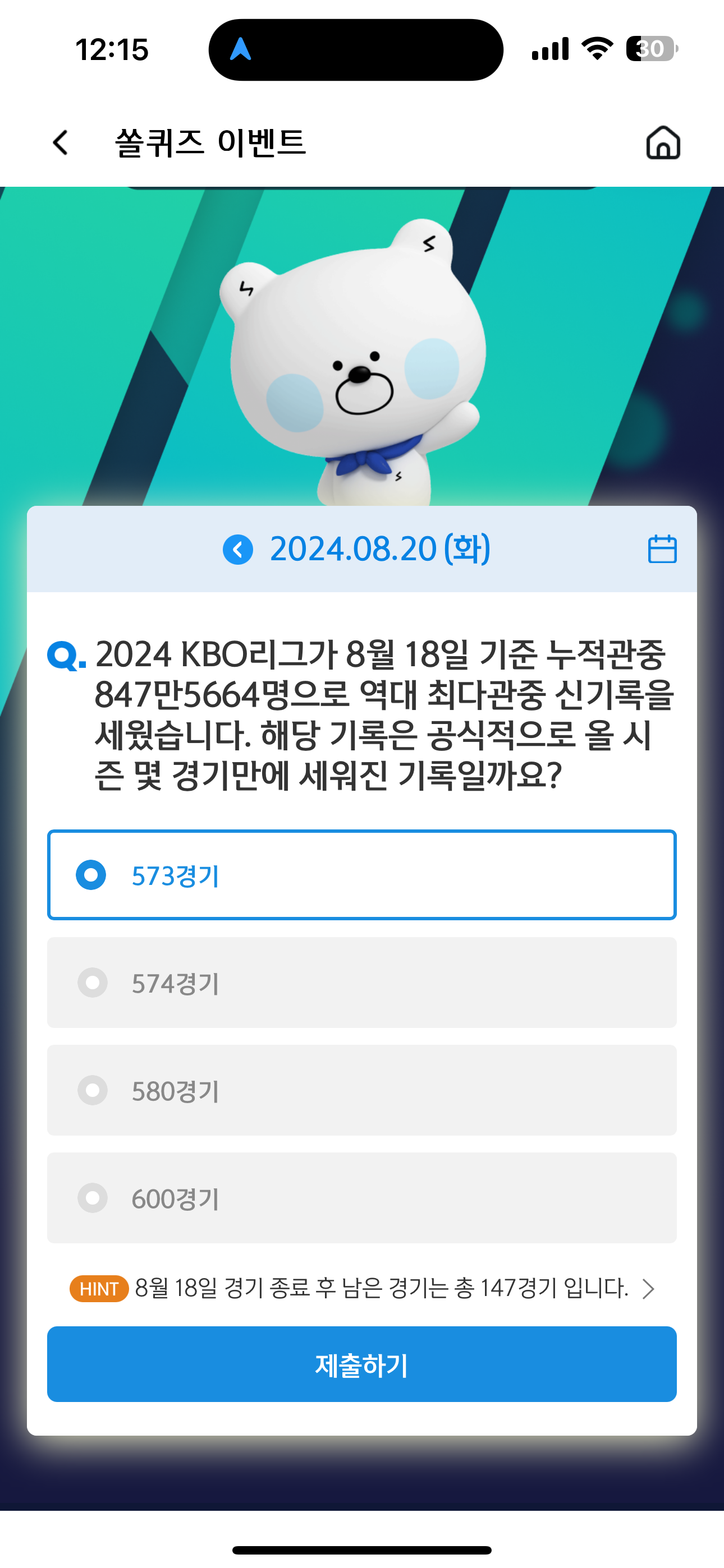 신한 슈퍼SOL 야구/상식 쏠퀴즈 정답은 573경기 입니다.