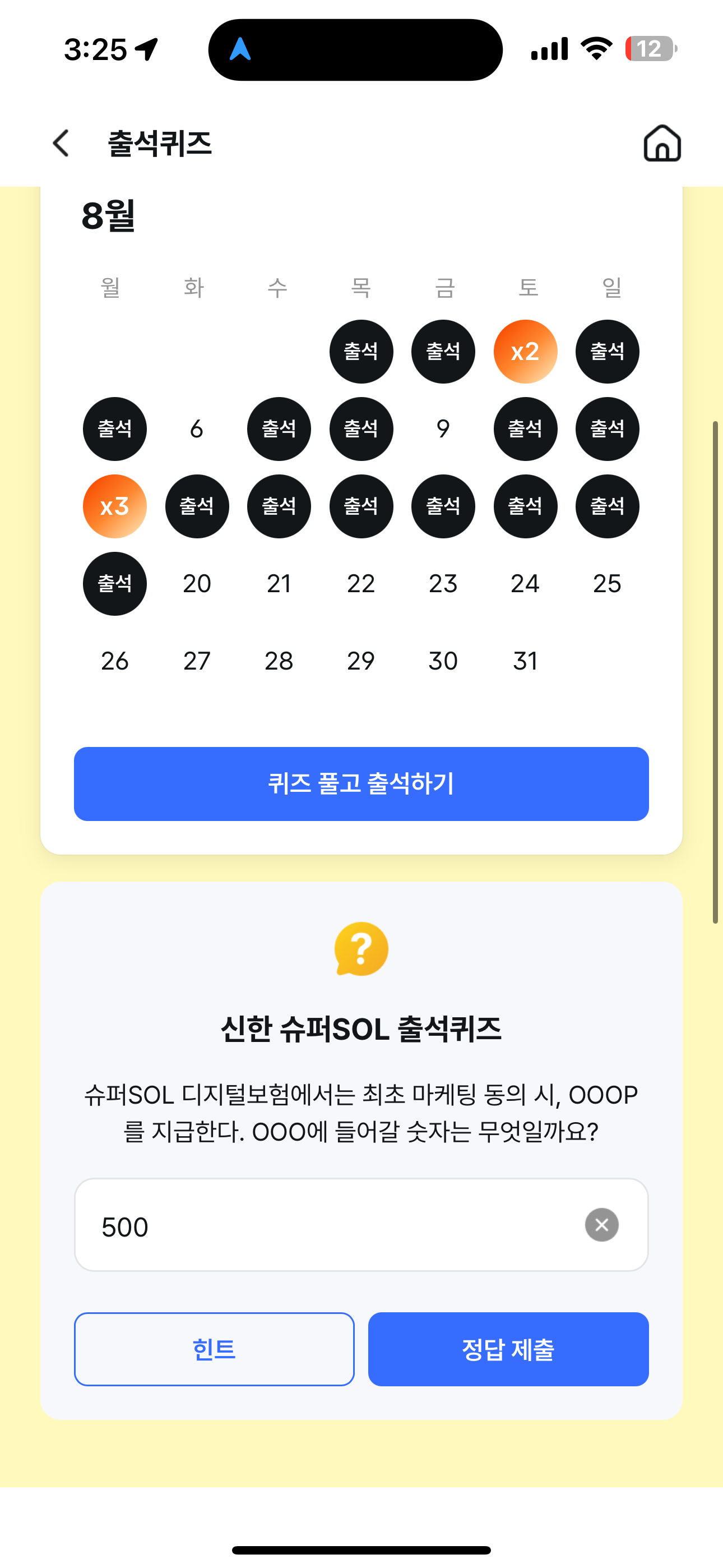 신한 슈퍼SOL 출석퀴즈 정답은 500 입니다
