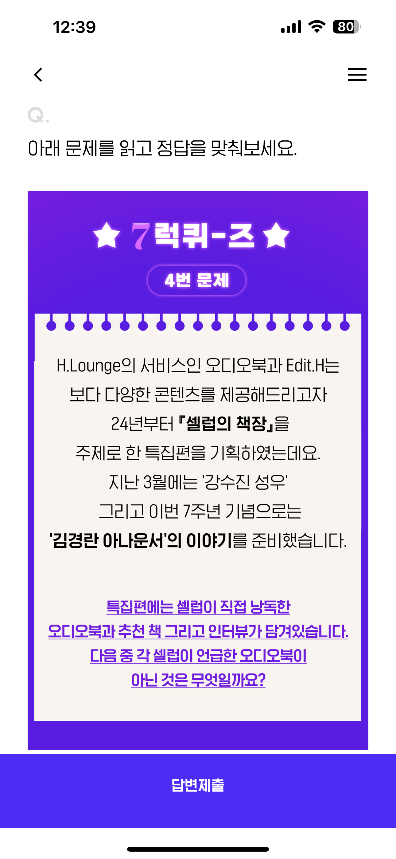 H포인트 퀴즈 8월 21일 정답(H.Lounge의 서비스인 오디오북과 Edit.H는 보다 다양한 콘텐츠를 제공해드리고자 24년부터 셀럽의 책장을 주제로 한 특집편을 기획하였는데요)