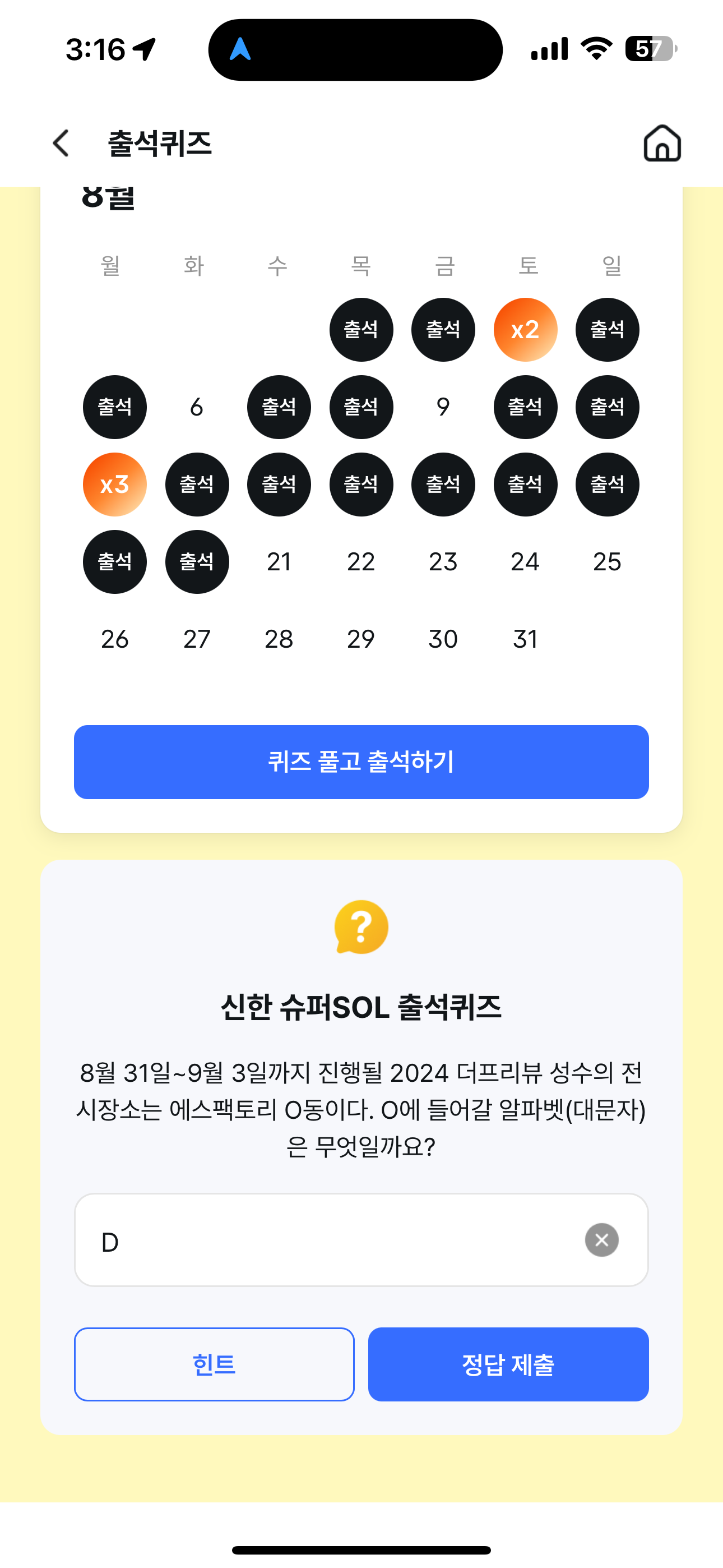 신한 슈퍼SOL 출석퀴즈 8월 21일 정답(8월 31일~9월 3일까지 진행될 2024 더프리뷰 성수의 전시장소는 엑스팩토리 O동이다)