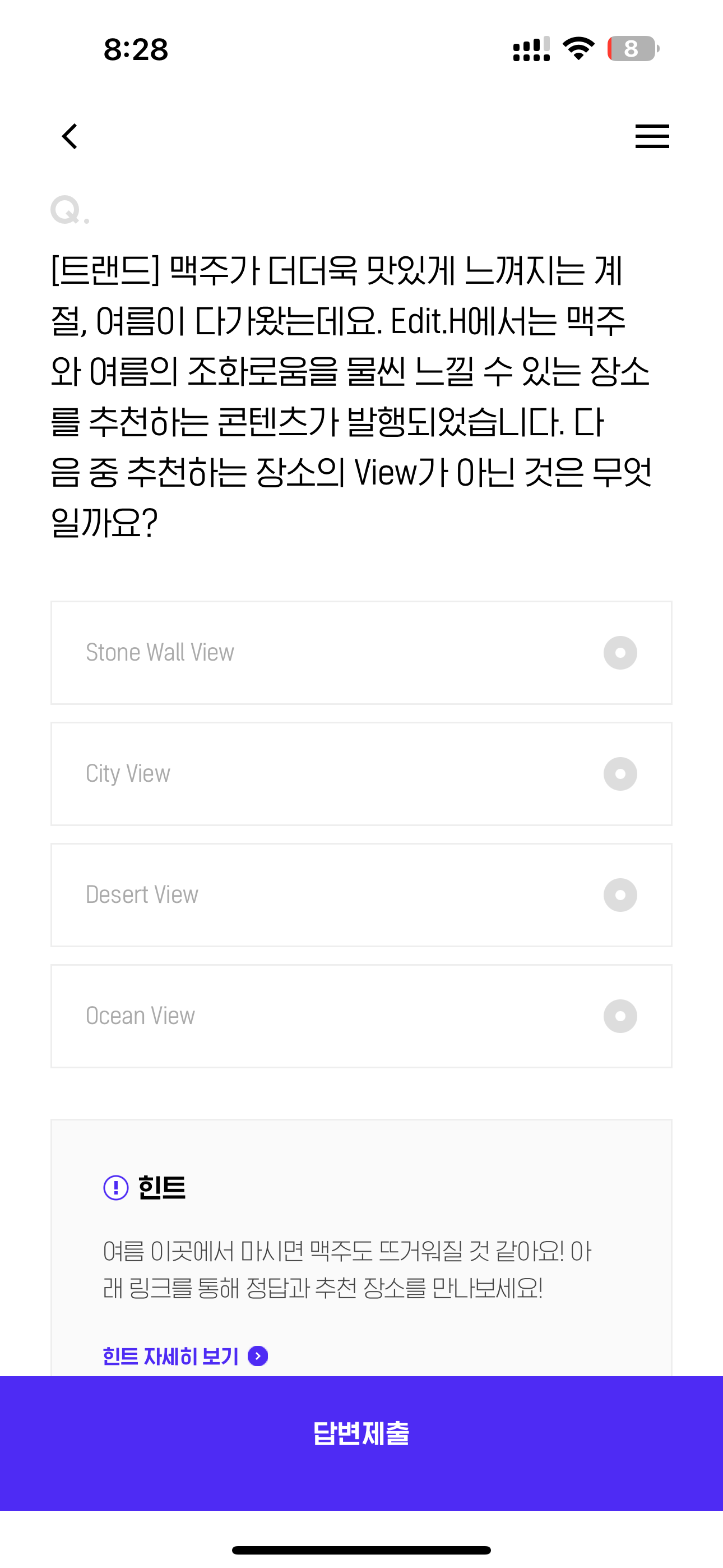 [트랜드] 맥주가 더더욱 맛있게 느껴지는 계절, 여름이 다가왔는데요. Edit.H에서는 맥주와 여름의 조화로움을 물씬 느낄 수 있는 장소를 추천하는 콘텐츠가 발행되었습니다. 다음 중 추천하는 장소의 View가 아닌 것은 무엇일까요? 보기는 1. Stone Wall View 2. City View 3. Desert View 4. Ocean View 입니다.