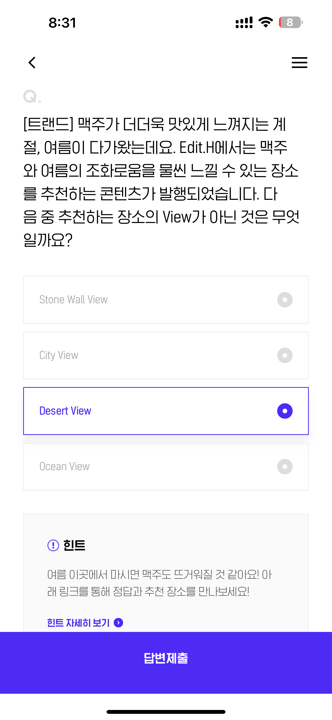 [트랜드] 맥주가 더더욱 맛있게 느껴지는 계절, 여름이 다가왔는데요. Edit.H에서는 맥주와 여름의 조화로움을 물씬 느낄 수 있는 장소를 추천하는 콘텐츠가 발행되었습니다. 다음 중 추천하는 장소의 View가 아닌 것은 무엇일까요? 보기는 1. Stone Wall View 2. City View 3. Desert View 4. Ocean View 입니다.