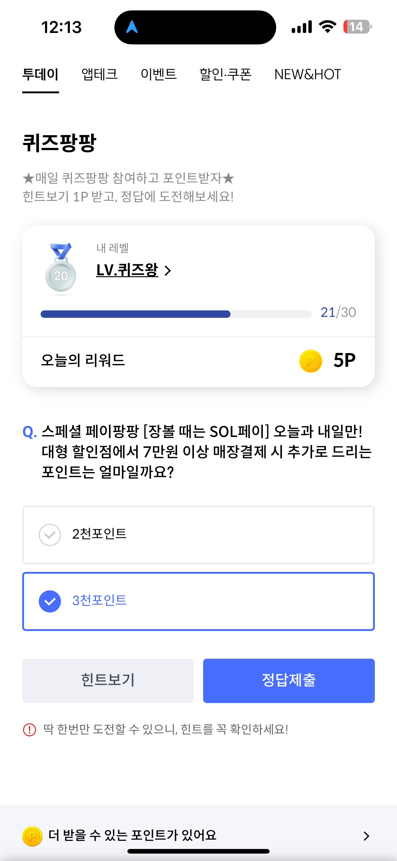 스페셜 페이팡팡 [장볼 때는 SOL페이] 오늘과 내일만! 대형 할인점에서 7만원 이상 매장결제 시 추가로 드리는 포인트는 얼마일까요? 보기는 1. 2천포인트 2. 3천포인트 입니다. 8월 23일, 24일만 대형 할인점에서 7만원 이상 결제하면 포인트를 받을 수 있습니다. 꽤 큰 포인트이니 잘 참고해서 활용해 보세요