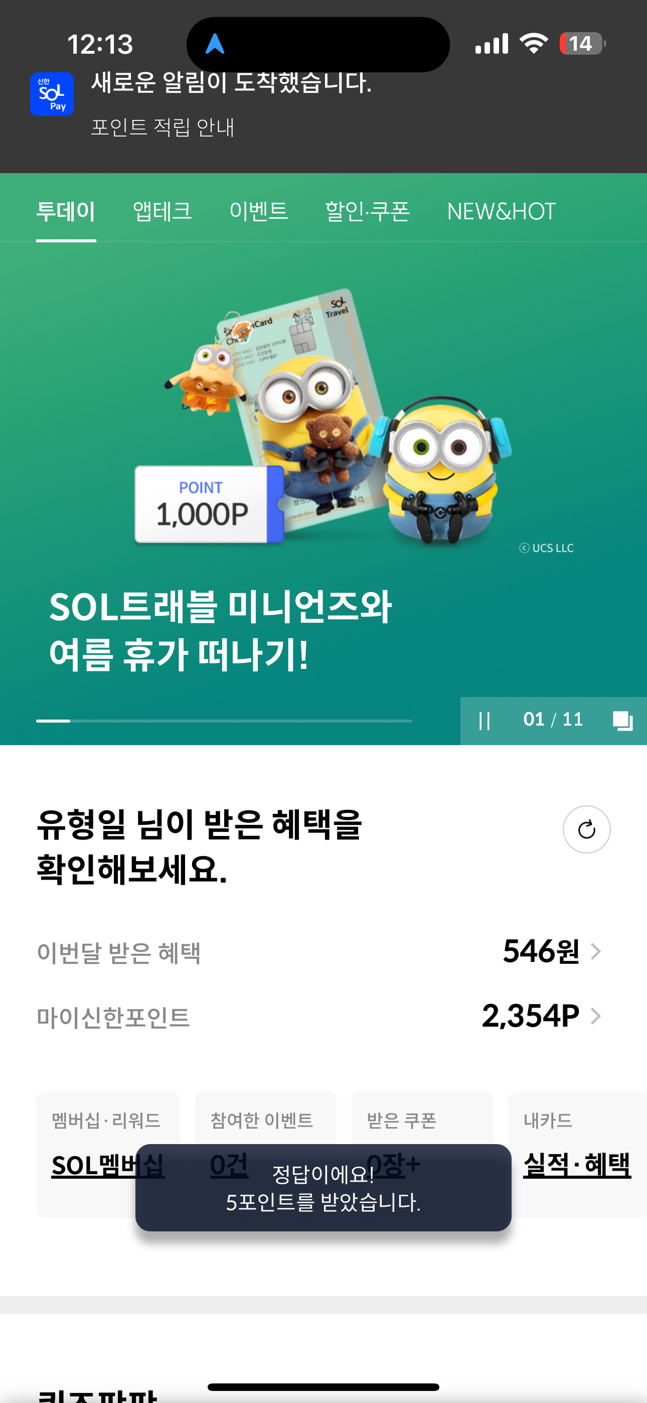 신한카드 퀴즈팡팡 정답은 3천포인트 입니다