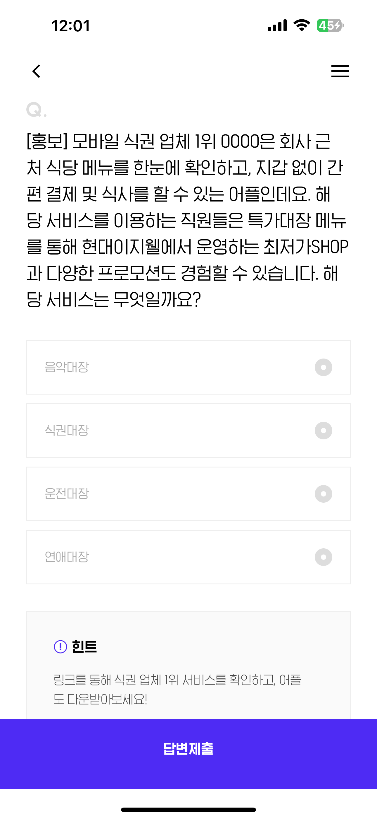 모바일 식권 업체 1위 OOOO은 회사 근처 식당 메뉴를 한눈에 확인하고, 지갑 없이 간편 결제 및 식사를 할 수 있는 어플인데요. 해당 서비스를 이용하는 직원들은 특가대장 메뉴를 통해 현대이지웰에서 운영하는 최저가SHOP과 다양한 프로모션도 경험할 수 있습니다. 해당 서비스는 무엇일까요? 보기는 1. 음악대장 2. 식권대장 3. 운전대장 4. 연애대장 입니다.