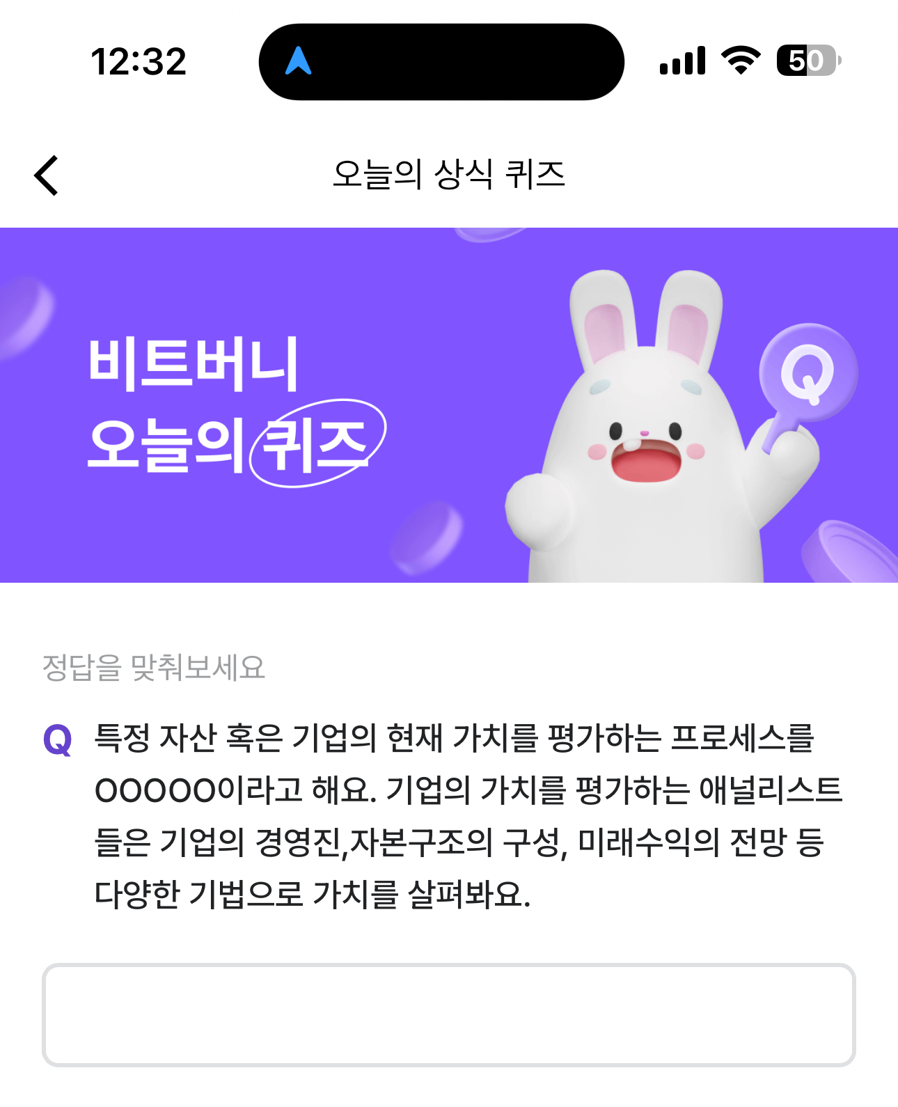 비트버니 오늘의 퀴즈 정답은 벨류에이션 입니다