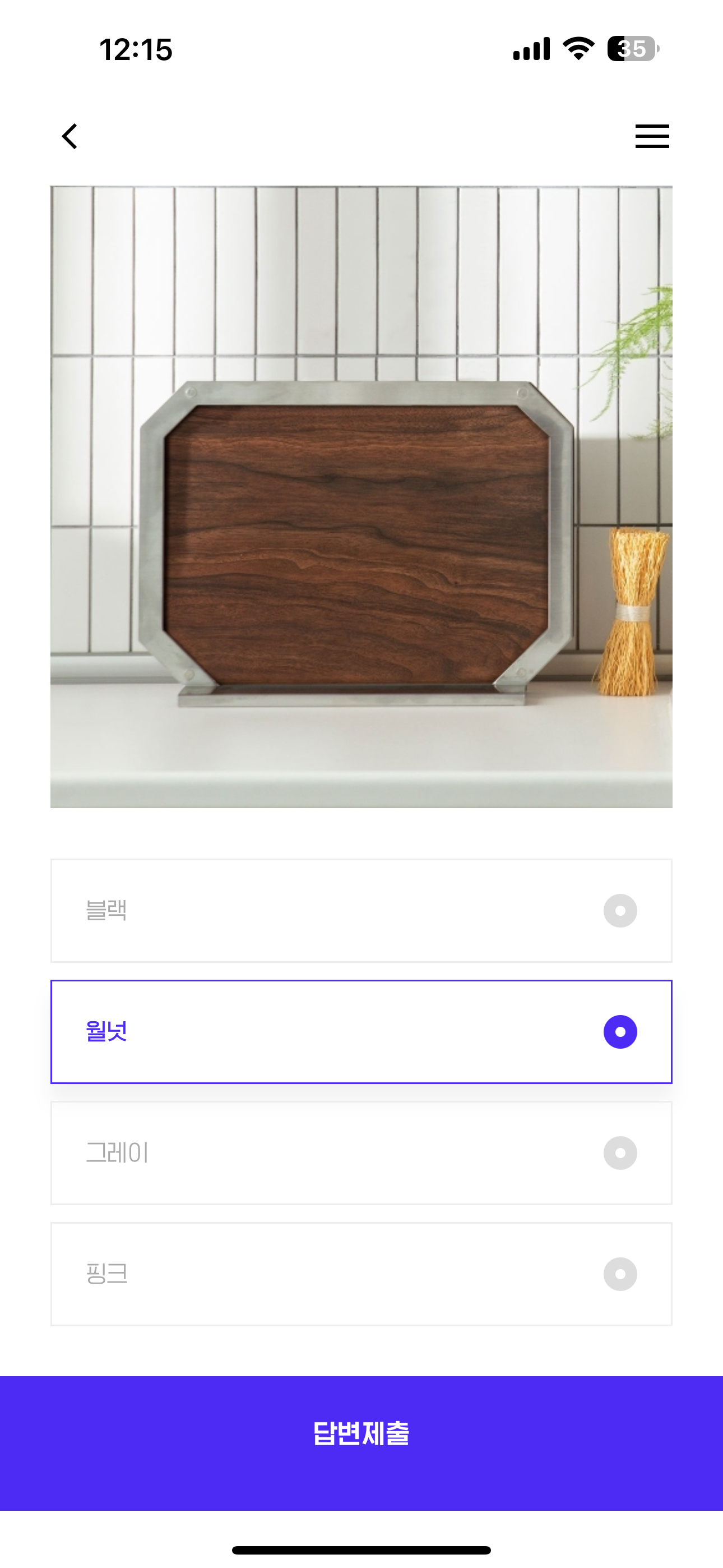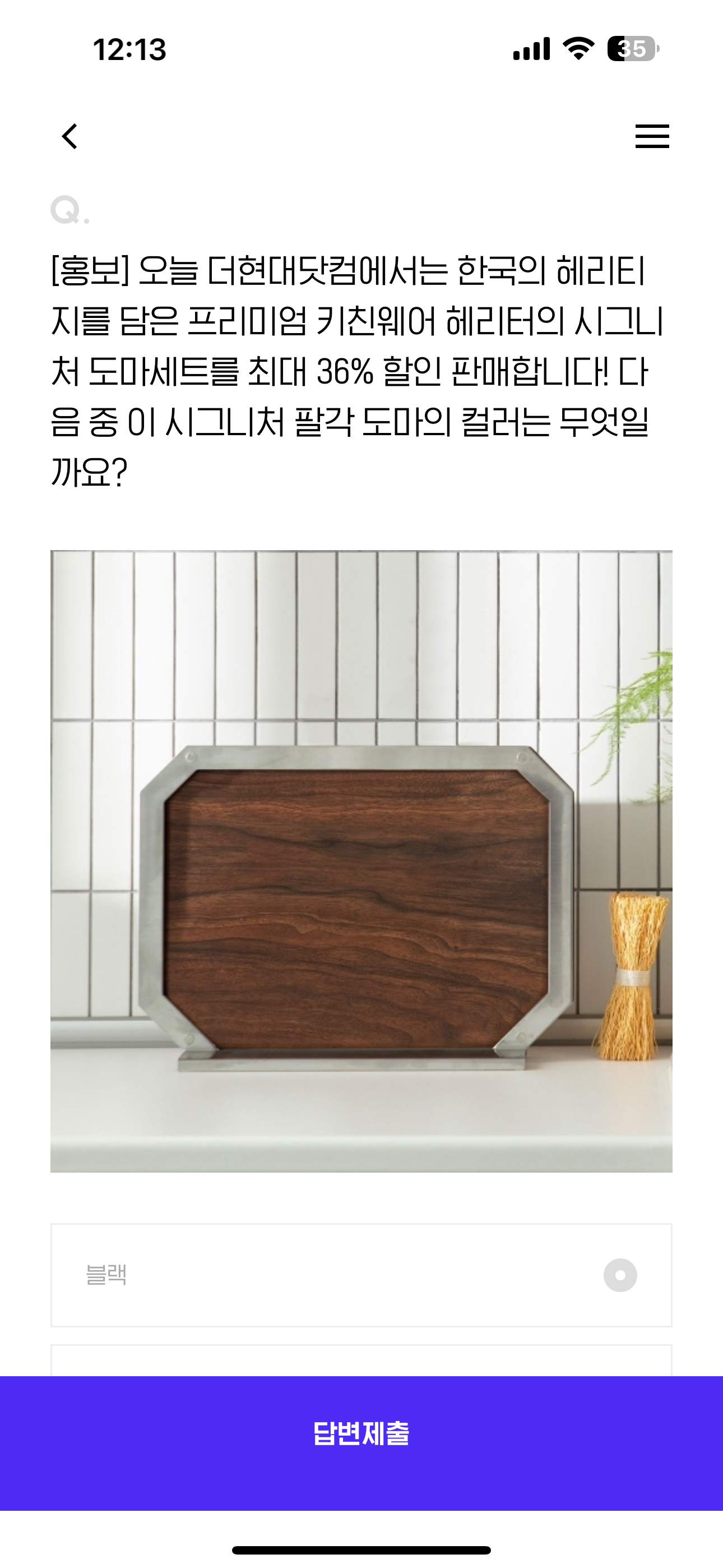 오늘 더현대닷컴에서는 한국의 헤리티지를 담은 프리미엄 키친웨어 헤리터의 시그니처 도마세트를 최대 36% 할인 판매합니다! 다음 중 이 시그니처 팔각 도마의 컬러는 무엇일까요? 보기는 1. 블랙 2. 월넛 3. 그레이 4. 핑크 입니다. 도마 색상은 주로 이 색상이 많이 사용되죠. 원목의 느낌을 살리고 있는