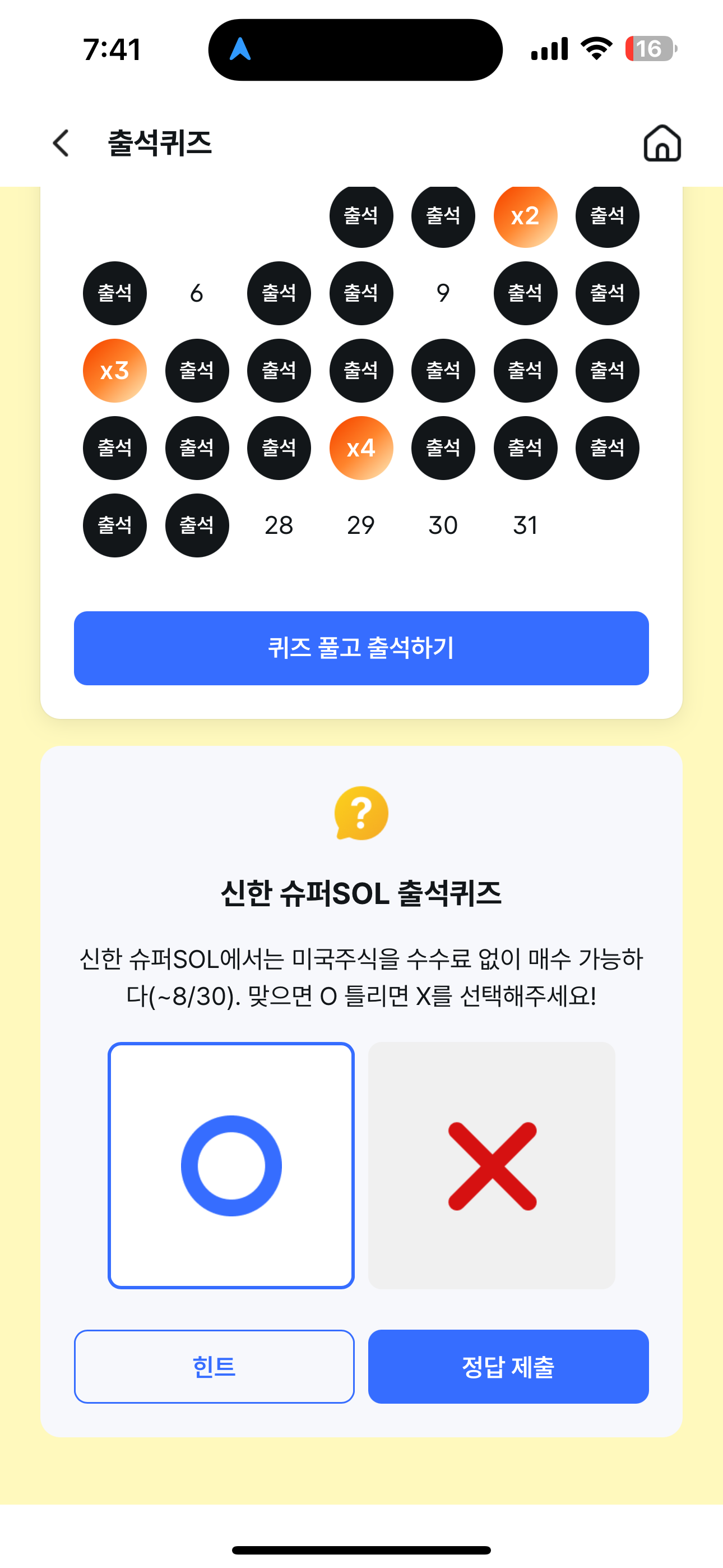 신한 슈퍼SOL 출석퀴즈 정답은 O 입니다