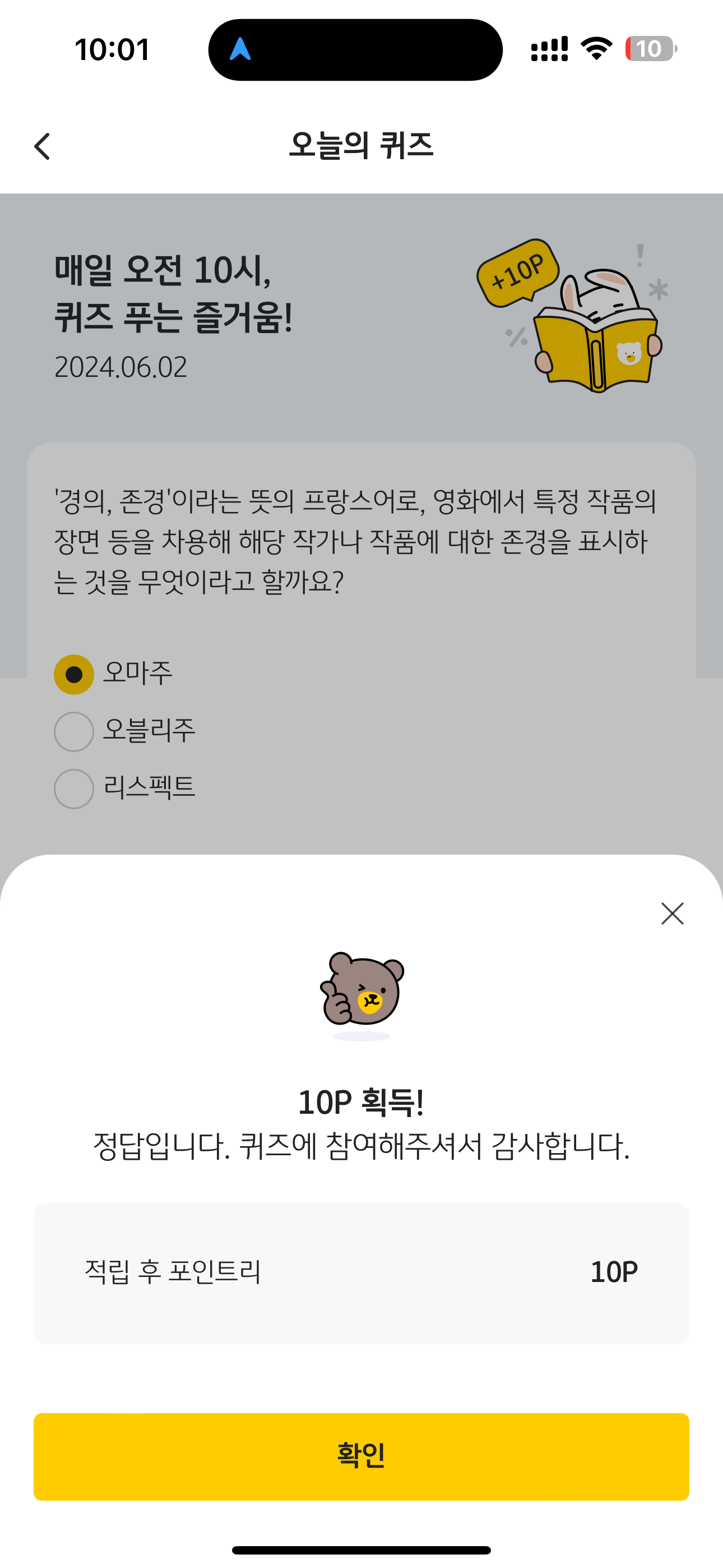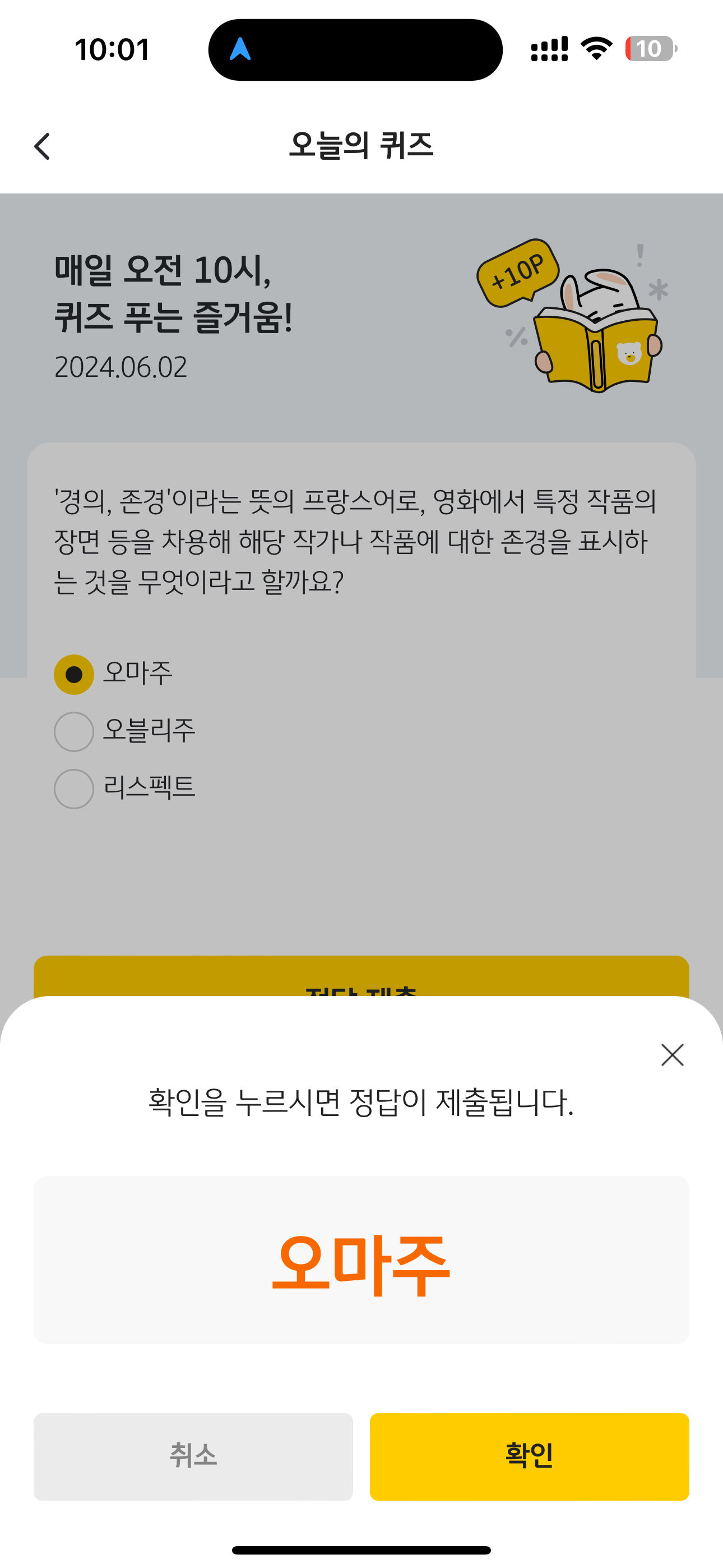 KB pay 오늘의 퀴즈 정답은 오마주 입니다