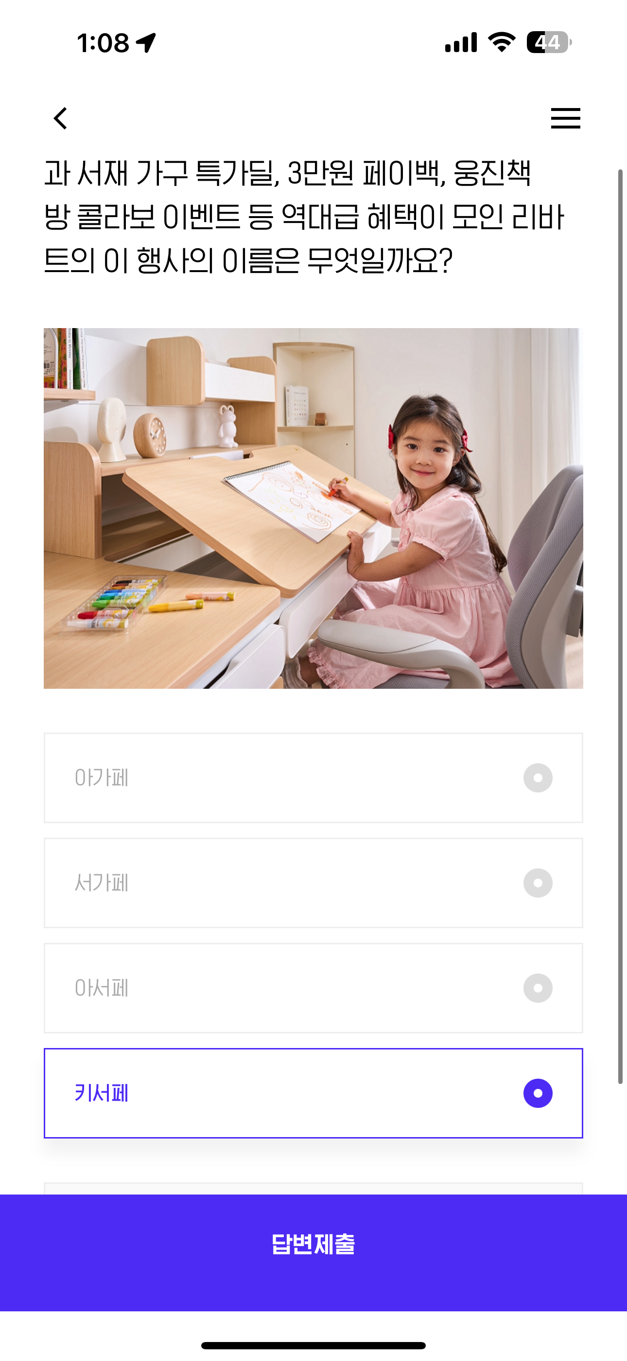 오늘은 OOO 마지막 날이에요! 아이방과 서재 가구 특가딜, 3만원 페이백, 웅진책방 콜라보 이벤트 등 역대급 혜택이 모인 리바트의 이 행사의 이름은 무엇일까요? 보기는 1. 아가페 2. 서가페 3. 아서페 4. 키서페 입니다. 아이방과 서재 가구를 고민하는 분들은 참고해 보세요
