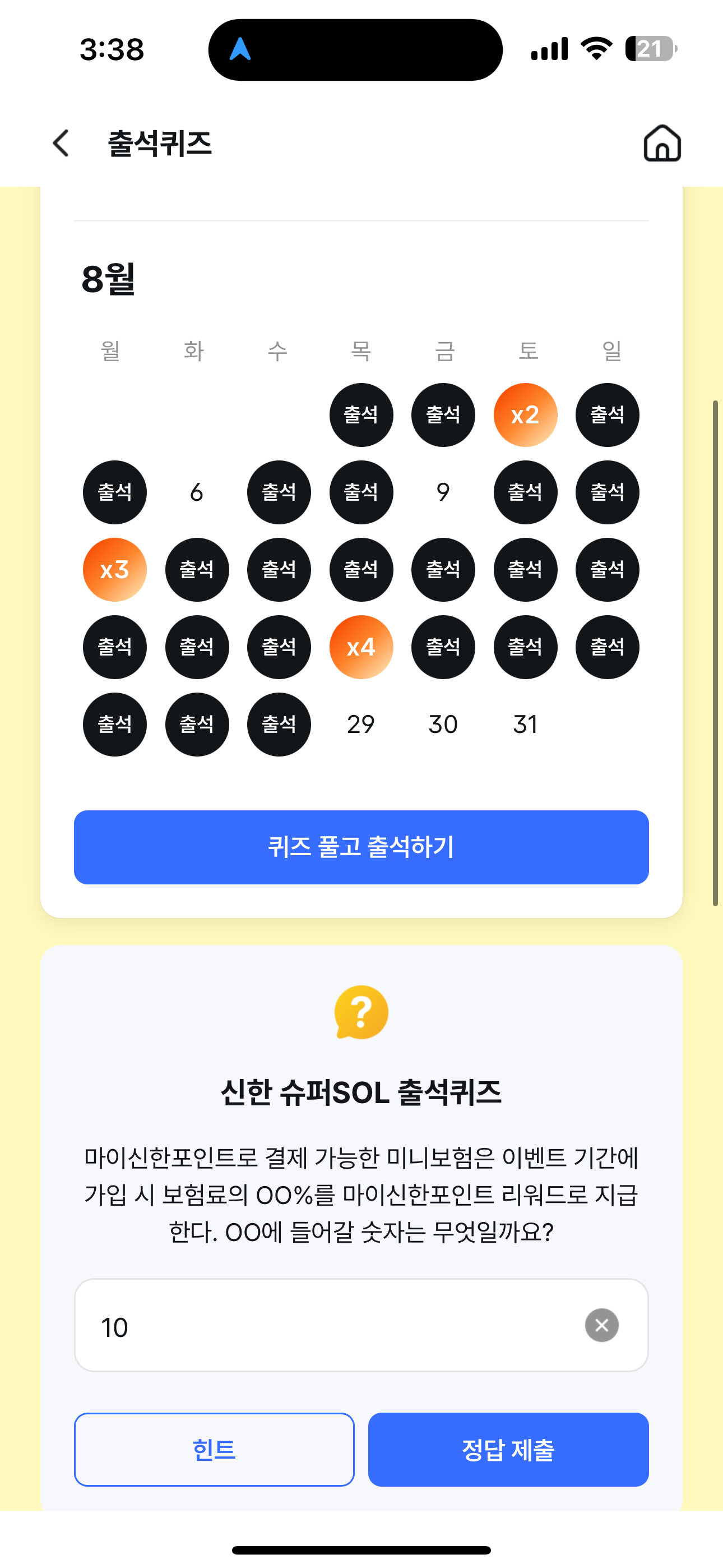 신한 슈퍼SOL 출석퀴즈 정답은 10 입니다