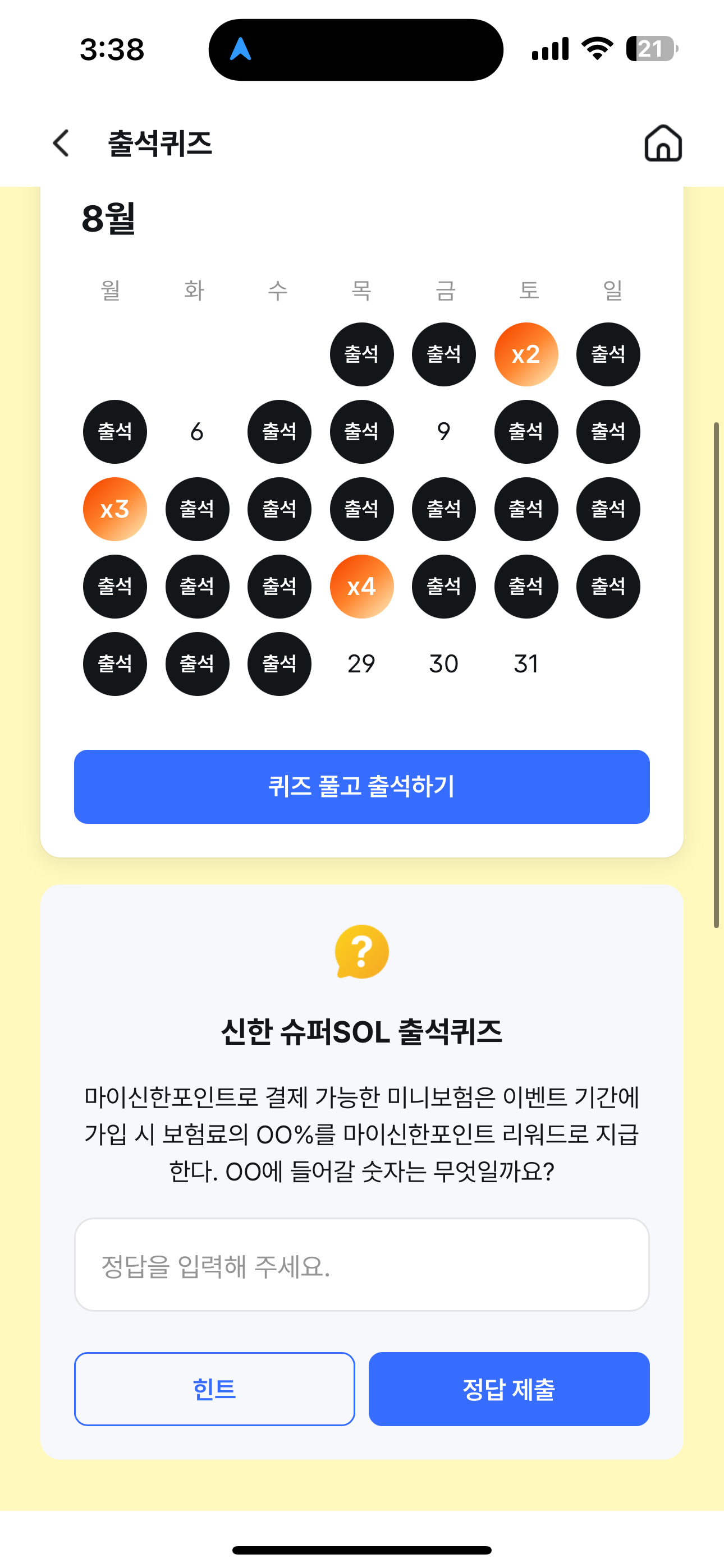 신한카드 퀴즈팡팡 8월 29일 정답(마이신한포인트로 결제 가능한 미니보험은 이벤트 기간에 가입 시 보험료의 OO%를 마이신한포인트 리워드로 지급한다 )