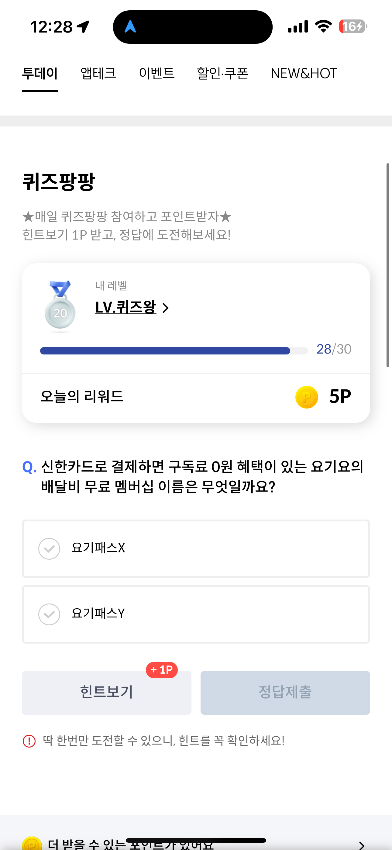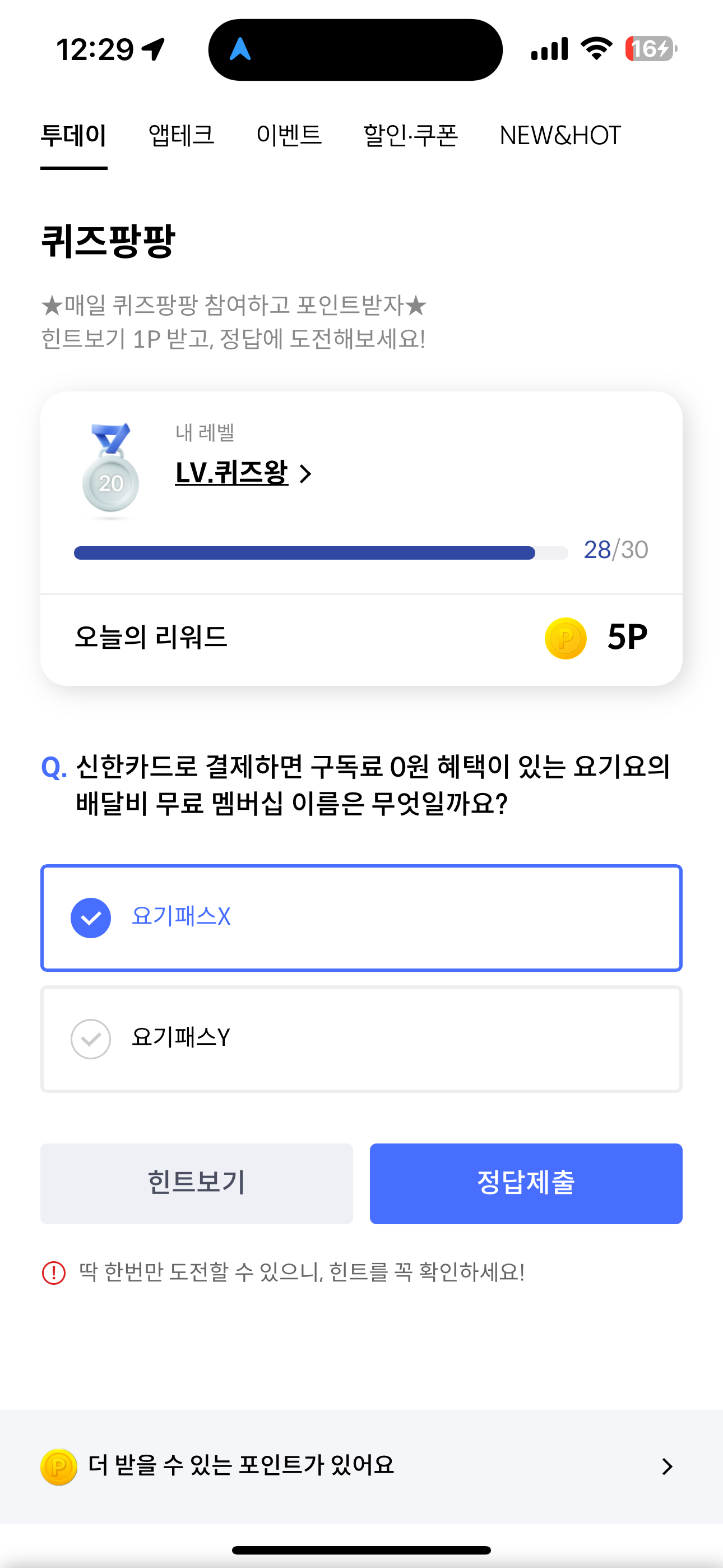 신한카드 퀴즈팡팡 정답은 요기패스X 입니다