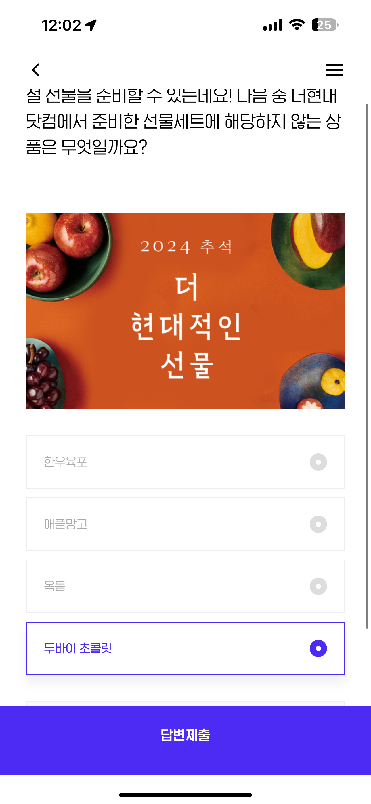 더현대닷컴에서는 온라인으로 쉽게 명절 선물을 준비할 수 있는데요! 다음 중 더현대닷컴에서 준비한 선물세트에 해당하지 않는 상품은 무엇일까요? 보기는 1. 한우육포 2. 애플망고 3. 옥돔 4. 두바이 초콜릿 입니다. 곧 추석 선물을 준비해야 하는데요. 할인 가격 참고해서 좋은 선택하세요