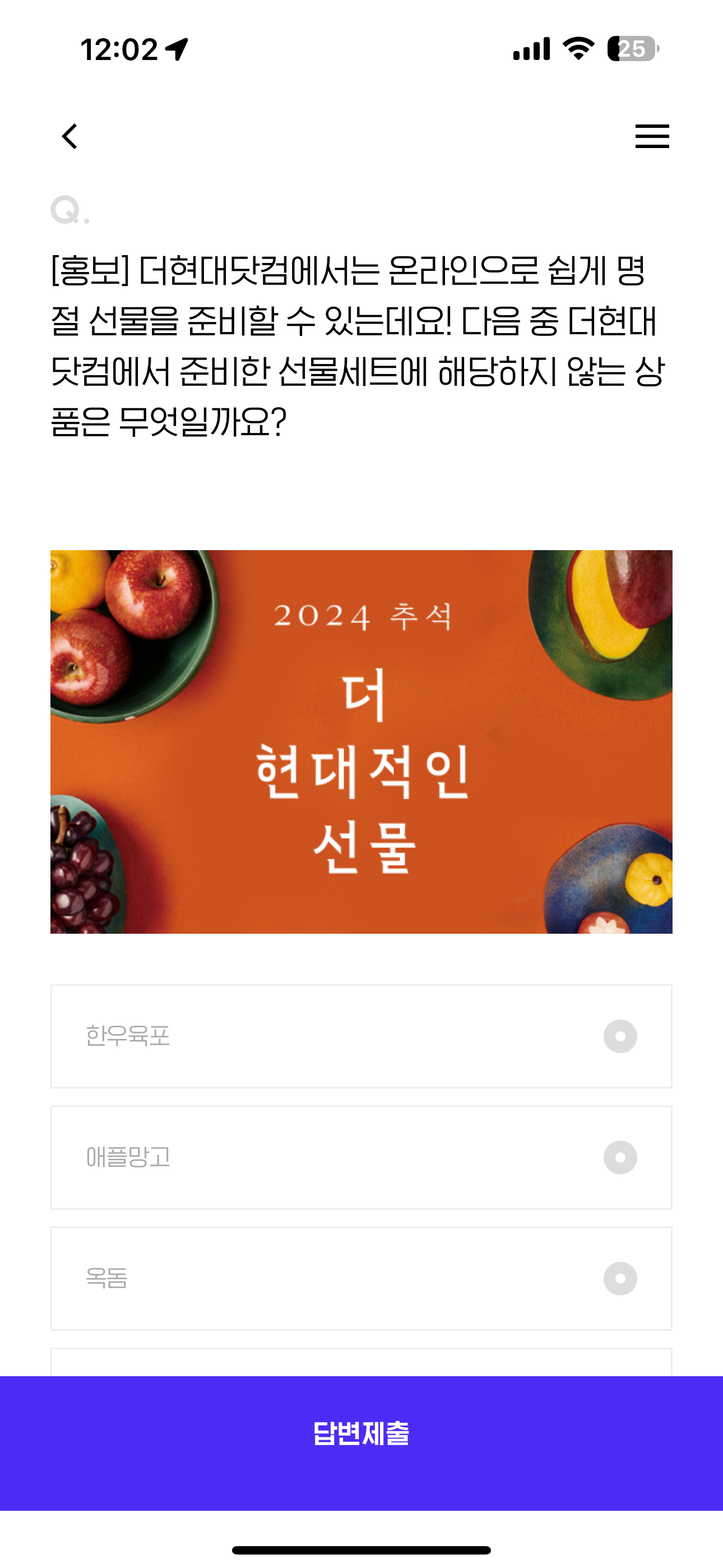 더현대닷컴에서는 온라인으로 쉽게 명절 선물을 준비할 수 있는데요! 다음 중 더현대닷컴에서 준비한 선물세트에 해당하지 않는 상품은 무엇일까요? 보기는 1. 한우육포 2. 애플망고 3. 옥돔 4. 두바이 초콜릿 입니다. 곧 추석 선물을 준비해야 하는데요. 할인 가격 참고해서 좋은 선택하세요
