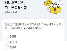 재테크5790 KB Pay 오늘의 퀴즈 1월 12일 정답(와이페이모어에서 KB국민 체크카드로 국내선 항공권 결제 시 최대 할인율은?) KB Pay 오늘의 퀴즈 1월 12일 문제입니다 와이페이모어에서 KB국민 체크카드로 국내선 항공권 결제 시 최대 할인율은? *준법감시인심의필260106-00034-HPM 보기는 1. 10% 2. 5% 3. 3% 입니다. 와이페이모어를 통해 저렴하게 항공권 구입이 가능하니 잘 참고해서 이용하세요 KB Pay 오늘의 퀴즈 정답은 10% 입니다 포인트는 현금 전환 가능하니 꼭 받으세요 2026. 1. 12. 신한 슈퍼SOL 출석퀴즈 1월 12일 정답(신한슈퍼SOL은 다양한 뉴스 정보를 제공한다) 신한 슈퍼SOL 출석퀴즈 1월 12일 문제입니다 신한슈퍼SOL은 다양한 뉴스 정보를 제공한다 O, X 퀴즈인데요. 신한슈퍼SOL은 다양한 정보를 볼 수 있는데요. 신한 슈퍼SOL에서는 다양한 서비스를 받을 수 있으니 잘 참고해서 활용해 보세요 신한 슈퍼SOL 출석퀴즈 정답은 O 입니다 포인트는 현금 전환 가능하니 꼭 받으세요 2026. 1. 12. 비트버니 오늘의 퀴즈 OX 퀴즈 1월 12일 정답(뱀은 귀가 없어서 소리를 전혀 듣지 못해요) 비트버니 오늘의 퀴즈 OX 퀴즈 1월 12일 문제입니다 뱀은 귀가 없어서 소리를 전혀 듣지 못해요 O, X 퀴즈인데요. 뱀은 귀가 있을까오? 없을까요? 뱀은 어떻게 사물을 알아보고 공격을 하고 몸을 피하는 걸까요? 상식으로 알아 두세요 비트버니 오늘의 퀴즈 OX 퀴즈 정답은 X 입니다 코인은 기프티콘 전환 가능하니 꼭 받으세요 2026. 1. 12. 비트버니 오늘의 퀴즈 1월 12일 ㄷㅅㅍㄷ 정답(둠(Doom, 파멸)'과 '스펜딩(Spending, 소비)'의 합성어로, "어차피 미래가 불안하니 지금 즐기자"는 심리에서 비롯된 충동적 소비 패턴을 OOOO이라고 해요) 비트버니 오늘의 퀴즈 1월 12일 문제입니다 둠(Doom, 파멸)'과 '스펜딩(Spending, 소비)'의 합성어로, "어차피 미래가 불안하니 지금 즐기자"는 심리에서 비롯된 충동적 소비 패턴을 OOOO이라고 해요. 주관식 퀴즈인데요. 비트버니 오늘의 퀴즈 초성 힌트는 ㄷㅅㅍㄷ 입니다 비트버니 오늘의 퀴즈 정답은 둠스펜딩 입니다 코인은 기프티콘 전환 가능하니 꼭 받으세요 2026. 1. 12. 신한카드 퀴즈팡팡 1월 12일 정답(화재 발생 시 실화배상책임 최대 10억원 보장, 화재손해 보상 최대 300만원 보장 등을 제공하는 '우리집케어' 서비스의 월 이용료는 얼마일까요?) 신한카드 퀴즈팡팡 1월 12일 문제입니다 화재 발생 시 실화배상책임 최대 10억원 보장, 화재손해 보상 최대 300만원 보장 등을 제공하는 '우리집케어' 서비스의 월 이용료는 얼마일까요? 보기는 1. 900원 2. 990원 입니다. 화재 발생 시 실화배상책임 최대 10억원이나 보장됩니다. 참고해 두세요 신한카드 퀴즈팡팡 정답은 900원 입니다 포인트는 현금 전환 가능하니 꼭 받으세요 2026. 1. 12. H포인트 퀴즈 1월 12일 정답(현대홈쇼핑에서 1월 9일 금요일부터 1월 15일 목요일까지, 제철 식품들과 리빙, 주방 용품들을 저렴하게 판매하는 '현대 톡마트 행사' 가 진행됩니다. 이번 현대 톡마트에서 최대 할인율은 몇 퍼센트일까요?) H포인트 퀴즈 1월 12일 문제입니다 현대홈쇼핑에서 1월 9일 금요일부터 1월 15일 목요일까지, 제철 식품들과 리빙, 주방 용품들을 저렴하게 판매하는 '현대 톡마트 행사' 가 진행됩니다. 이번 현대 톡마트에서 최대 할인율은 몇 퍼센트일까요? 보기는 1. 0% 2. 100% 3. 999% 4. 66% 입니다 H포인트 퀴즈 정답은 66% 입니다 포인트는 현금 전환 가능하니 꼭 받으세요 2026. 1. 12. 이전 1 2 3 4 ··· 965 다음