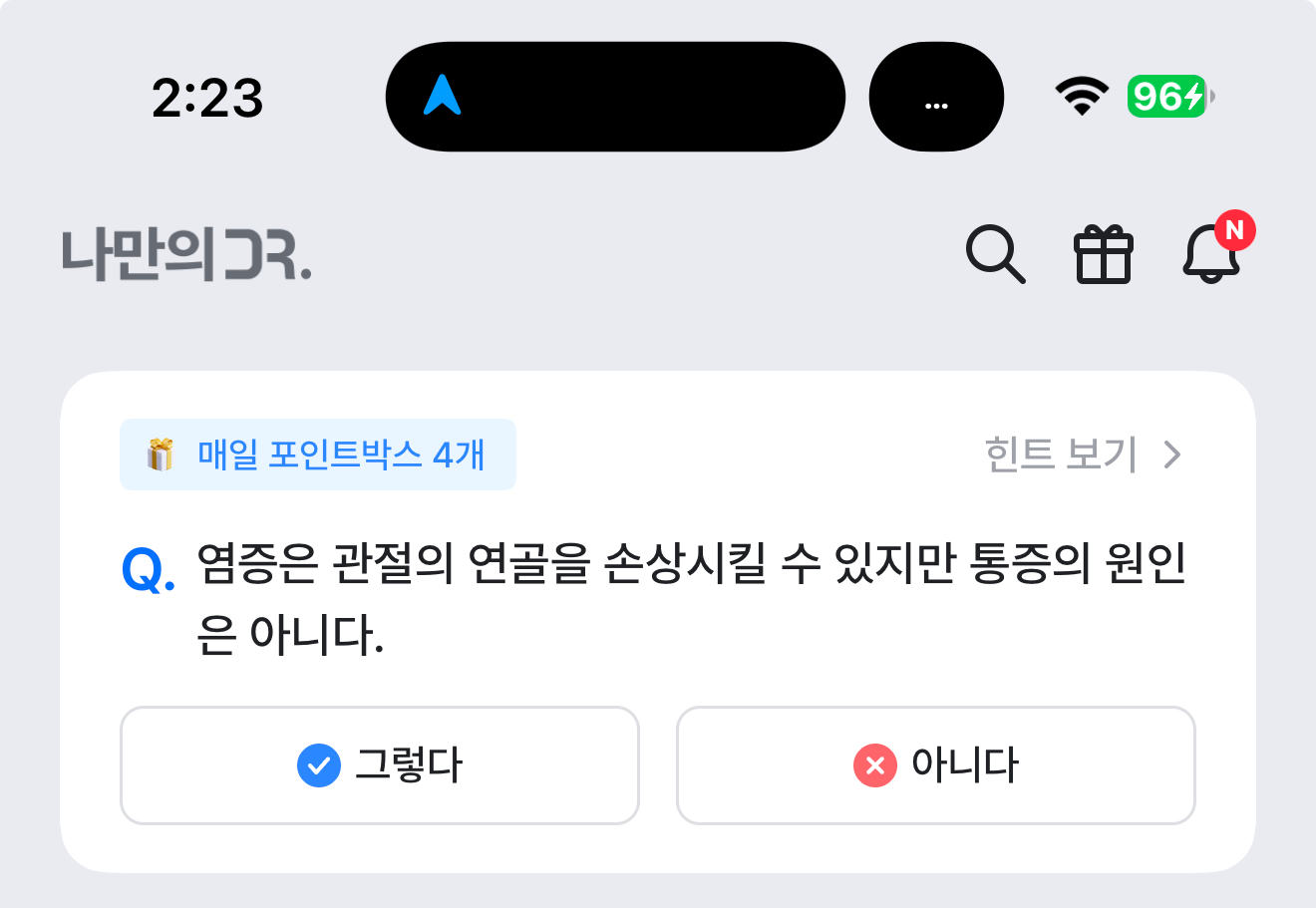 나만의 닥터 퀴즈 11월 27일 정답(염증은 관절의 연골을 손상시킬 수 있지만 통증의 원인은 아니다)