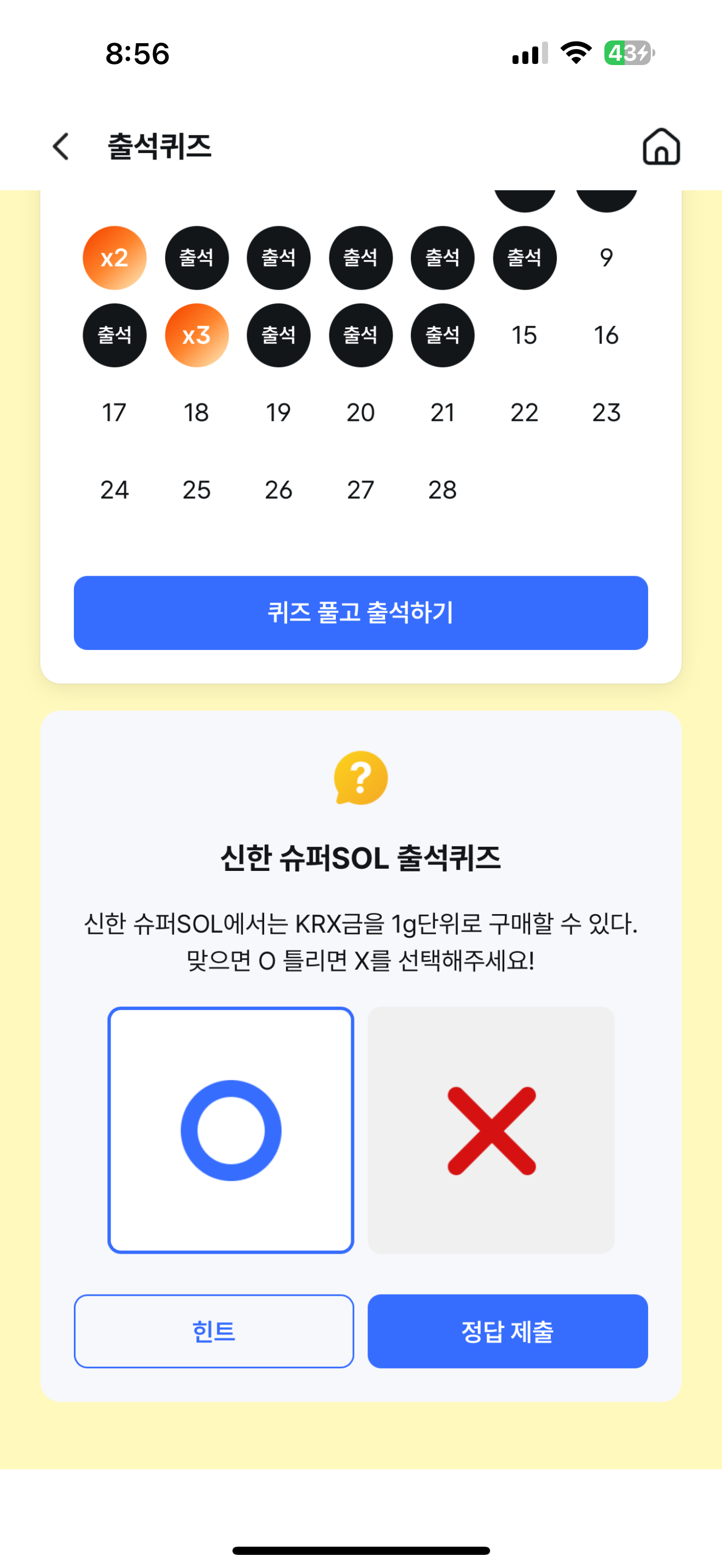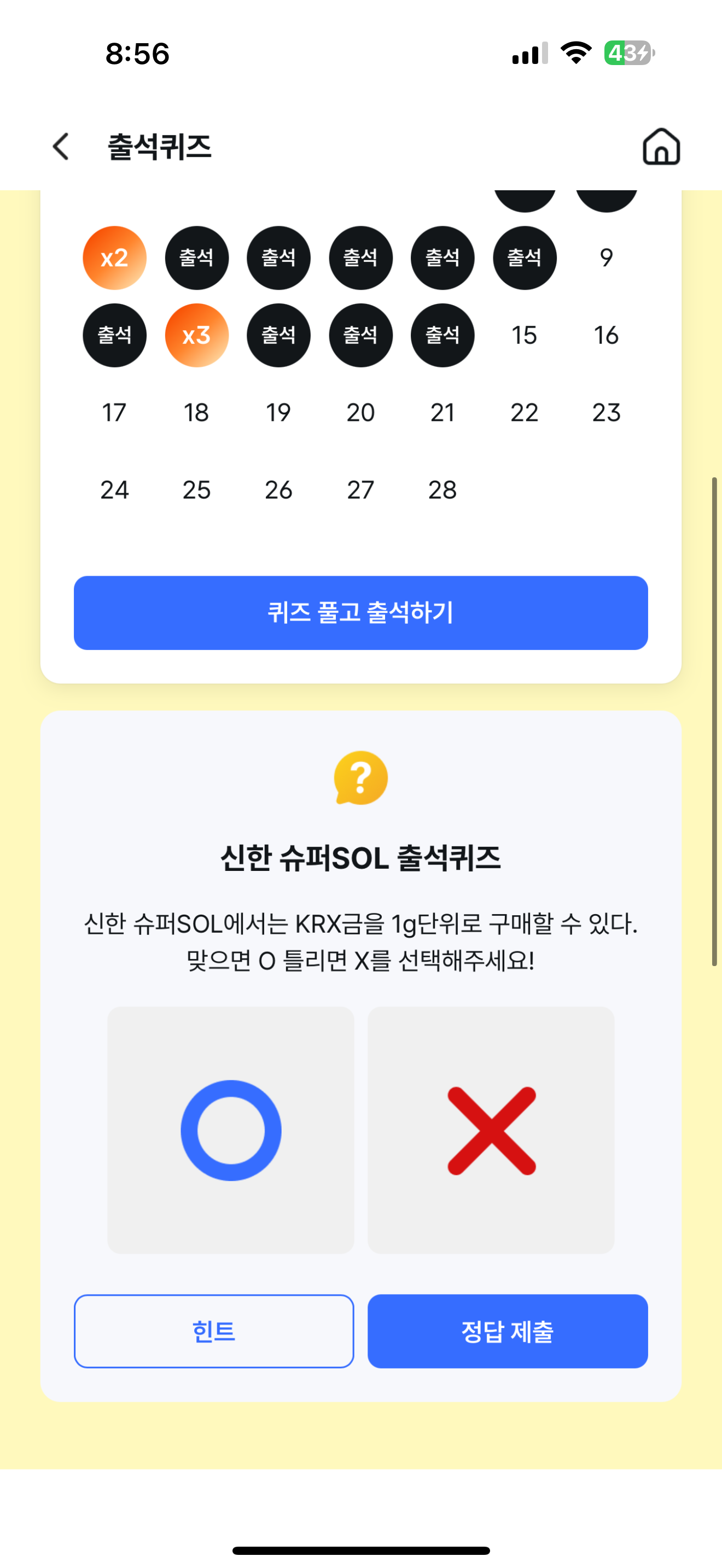 신한 슈퍼SOL 출석퀴즈 2월 15일 정답(신한 슈퍼SOL에서는 KRX금을 1g단위로 구매할 수 있다. 맞으면 O 틀리면 X를 선택해주세요!)