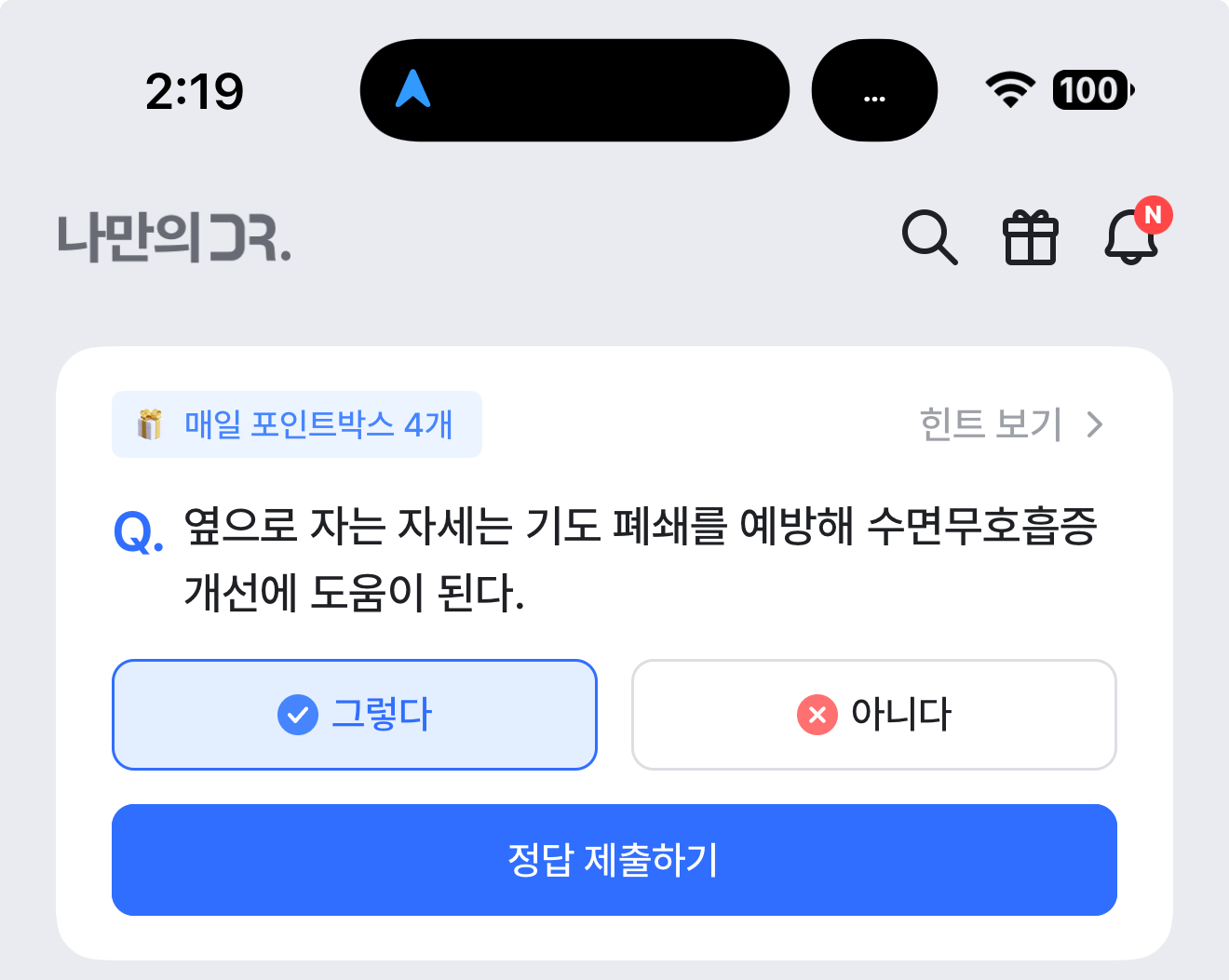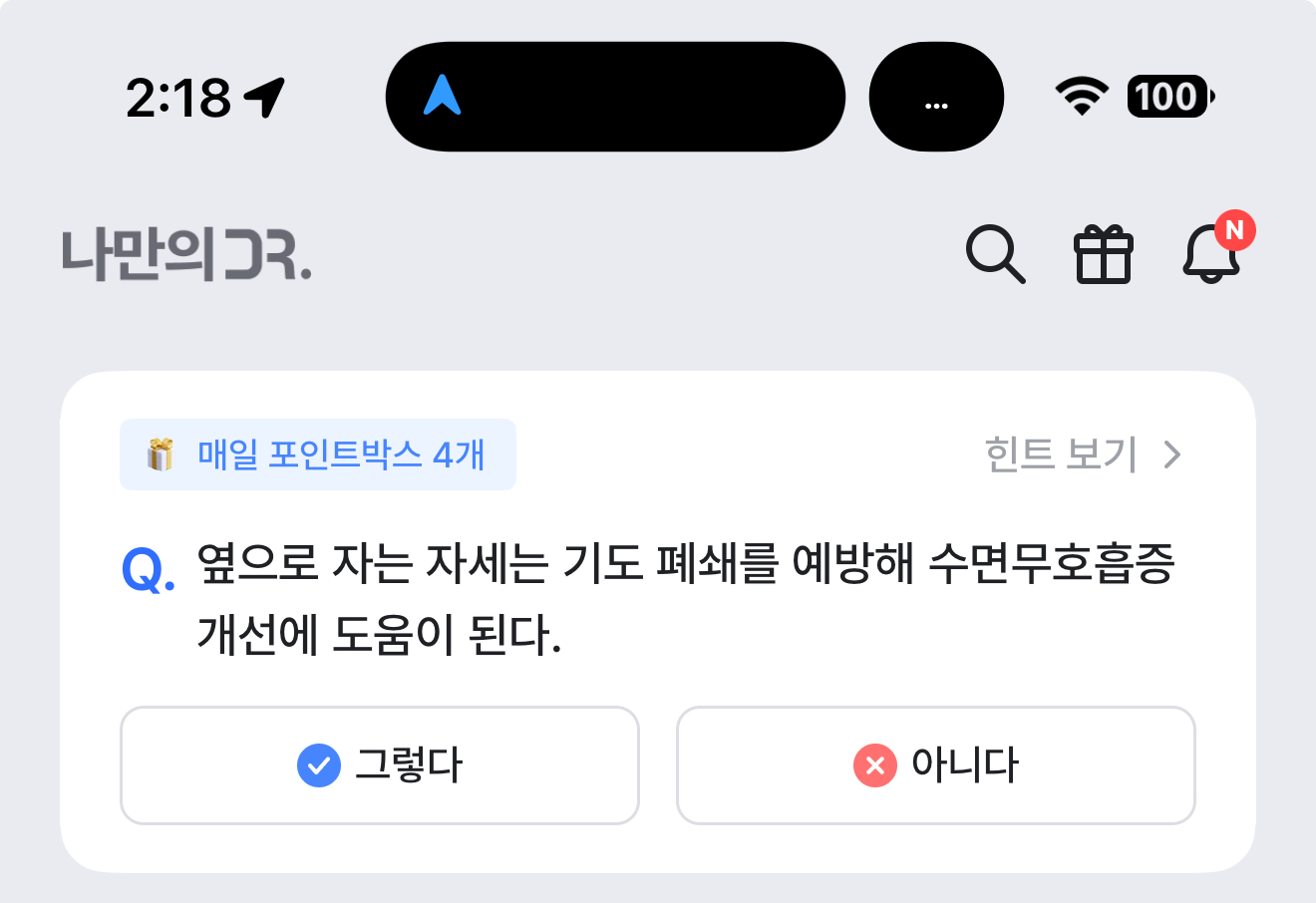 나만의 닥터 퀴즈 2월 18일 정답(옆으로 자는 자세는 기도 폐쇄를 예방해 수면무호흡증 개선에 도움이 된다)