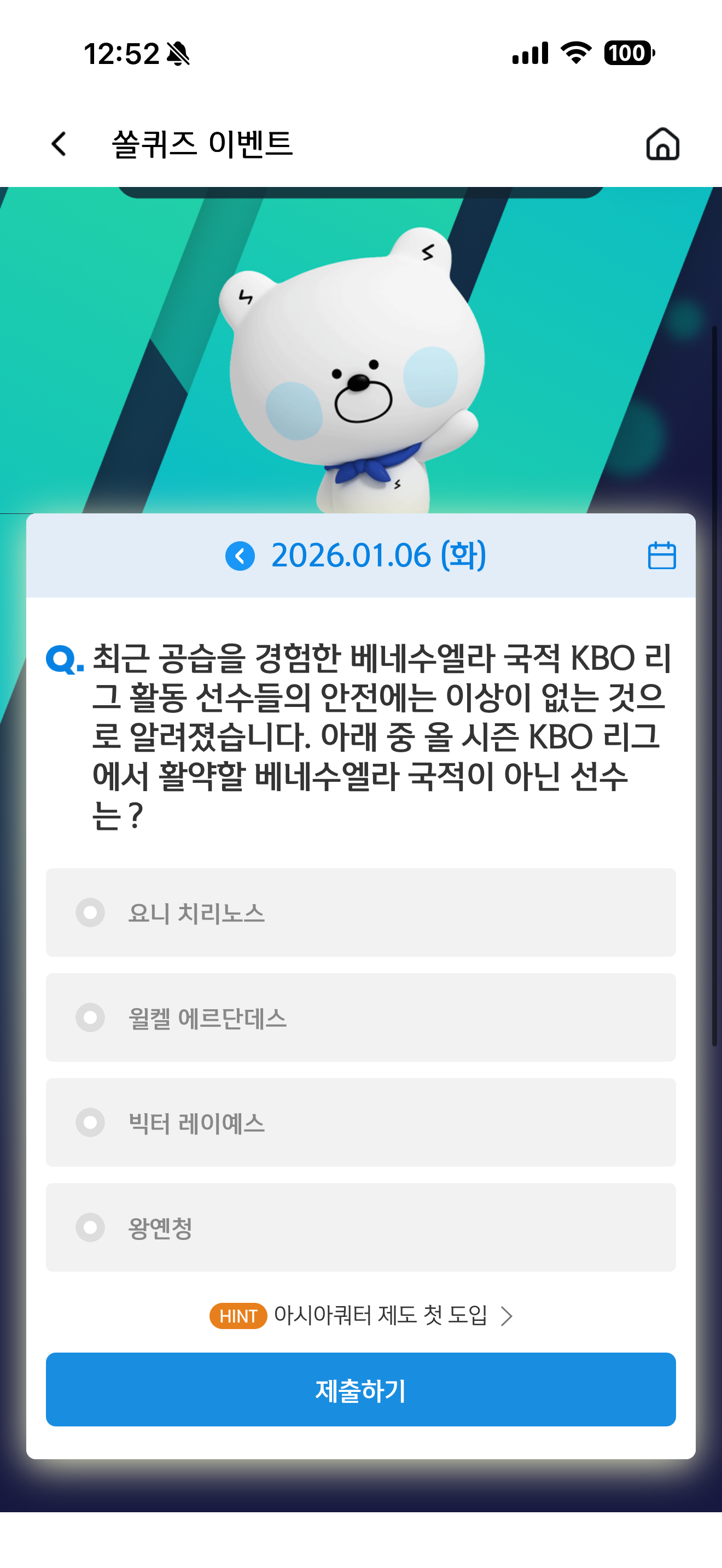 신한 슈퍼SOL 야구/상식 쏠퀴즈 1월 6일 정답(최근 공습을 경험한 베네수엘라 국적 KBO 리그 활동 선수들의 안전에는 이상이 없는 것으로 알려졌습니다. 아래 중 올 시즌 KBO 리그에서 활약할 베네수엘라 국적이 아닌 선수는?)