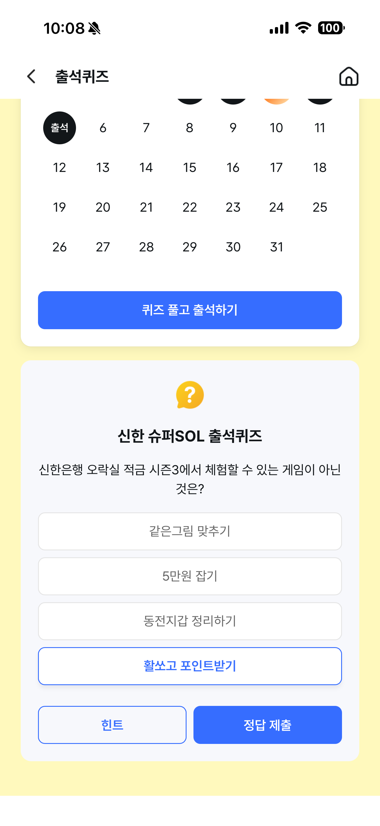 신한 슈퍼SOL 출석퀴즈 정답은 활쏘고 포인트받기 입니다