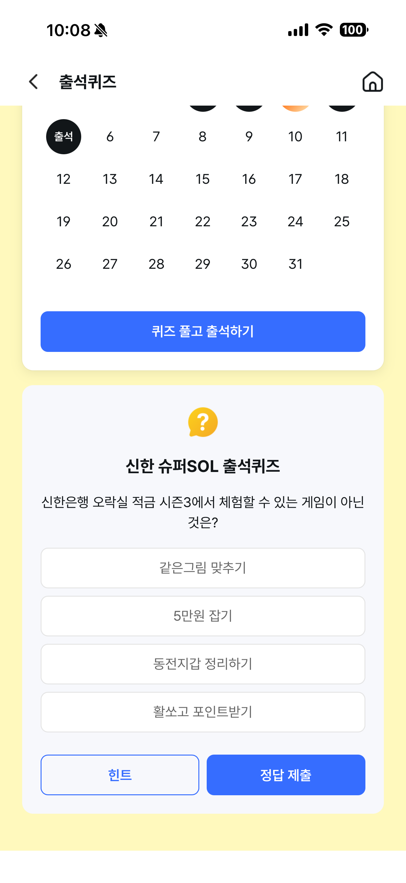 신한 슈퍼SOL 출석퀴즈 1월 6일 정답(신한은행 오락실 적금 시즌3에서 체험할 수 있는 게임이 아닌 것은?)