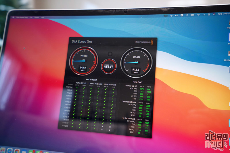 WD 마이 패스포트 SSD는 NVMe 기반으로 최대 읽기 속도 1,050MB/s, 최대 쓰기 속도 1,000MB/s의 고성능을 제공합니다. 실제 디스크 스피드 테스트로 해보니 쓰기 속도 943.9MB/s, 읽기 속도 912/3 MB/s가 나왔습니다. 정말 놀라운 데이터 전송 속도를 보여주고 있습니다.