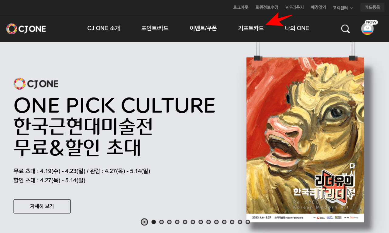 CJ 기프트카드 등록은 CJONE 홈페이지나 앱으로 할 수 있습니다. 상단 메뉴에 보면 기프트카드라고 있습니다.