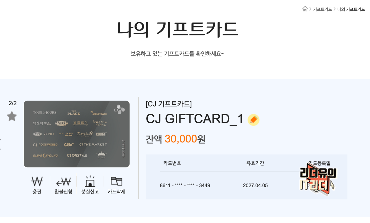 이제 CJONE 사이트 기프트카드 메뉴에 가면 얼마의 잔액과 유효기간이 있는지 쉽게 확인이 가능합니다. CJ 기프트카드 등록하기 어렵지 않죠. 가지고 있는 카드들 잘 등록해서 스마트하게 사용해 보시면 좋을 것 같습니다.