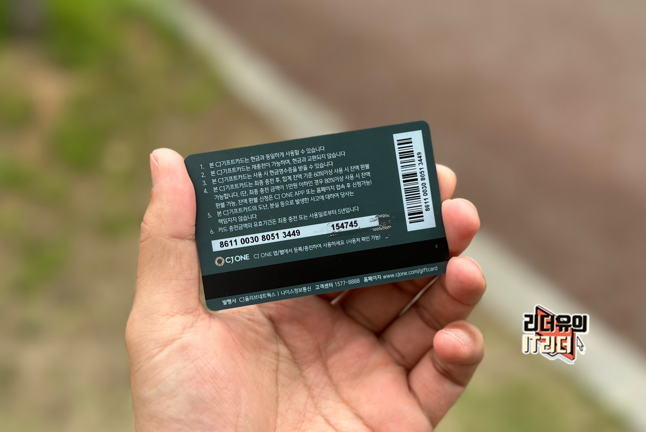 CJ 기프트카드 후면에는 카드 번호와 스크래치 후 확인할 수 있는 인증번호 6자리가 있습니다. 카드 등록할 때 필요한 번호입니다.