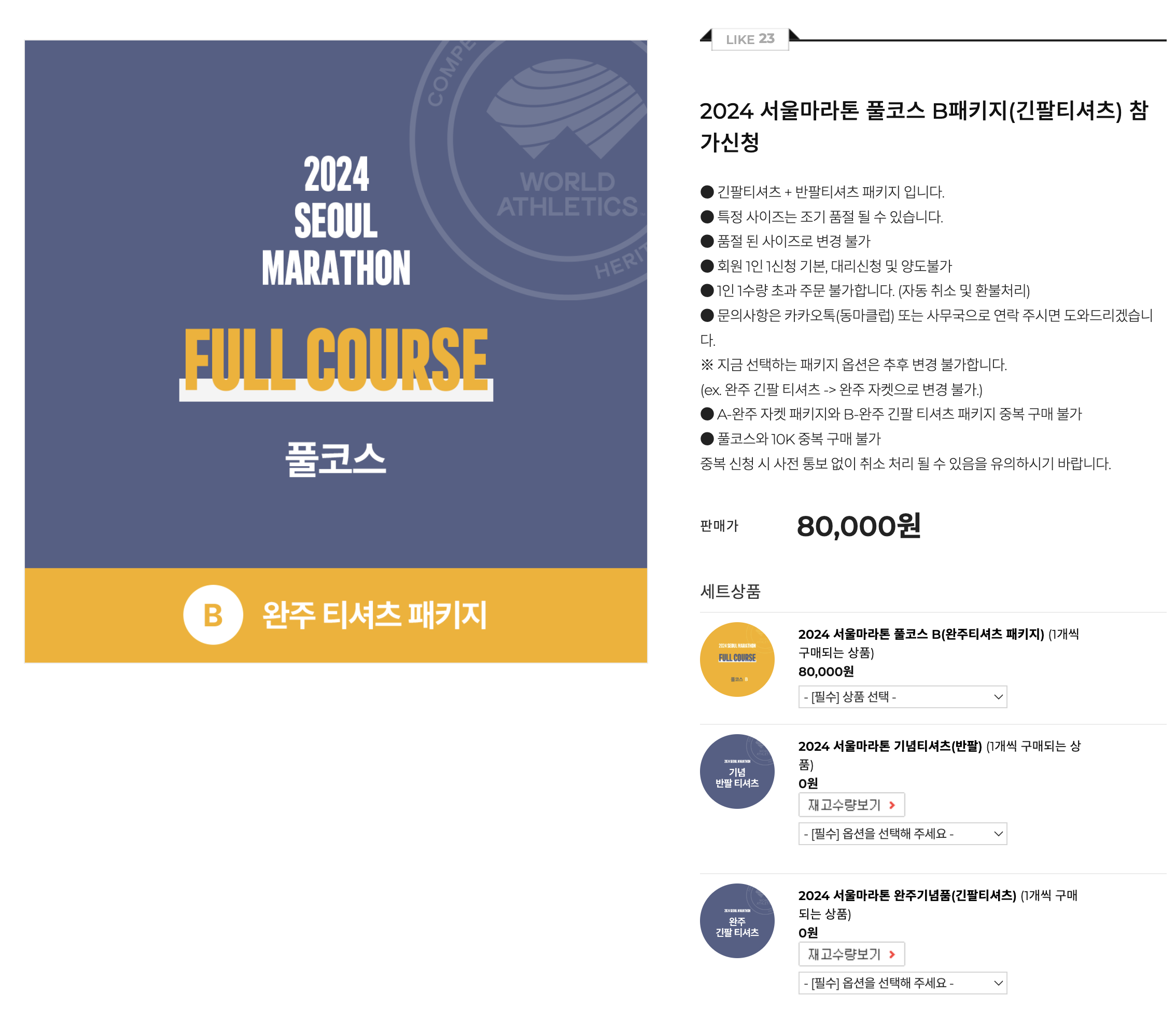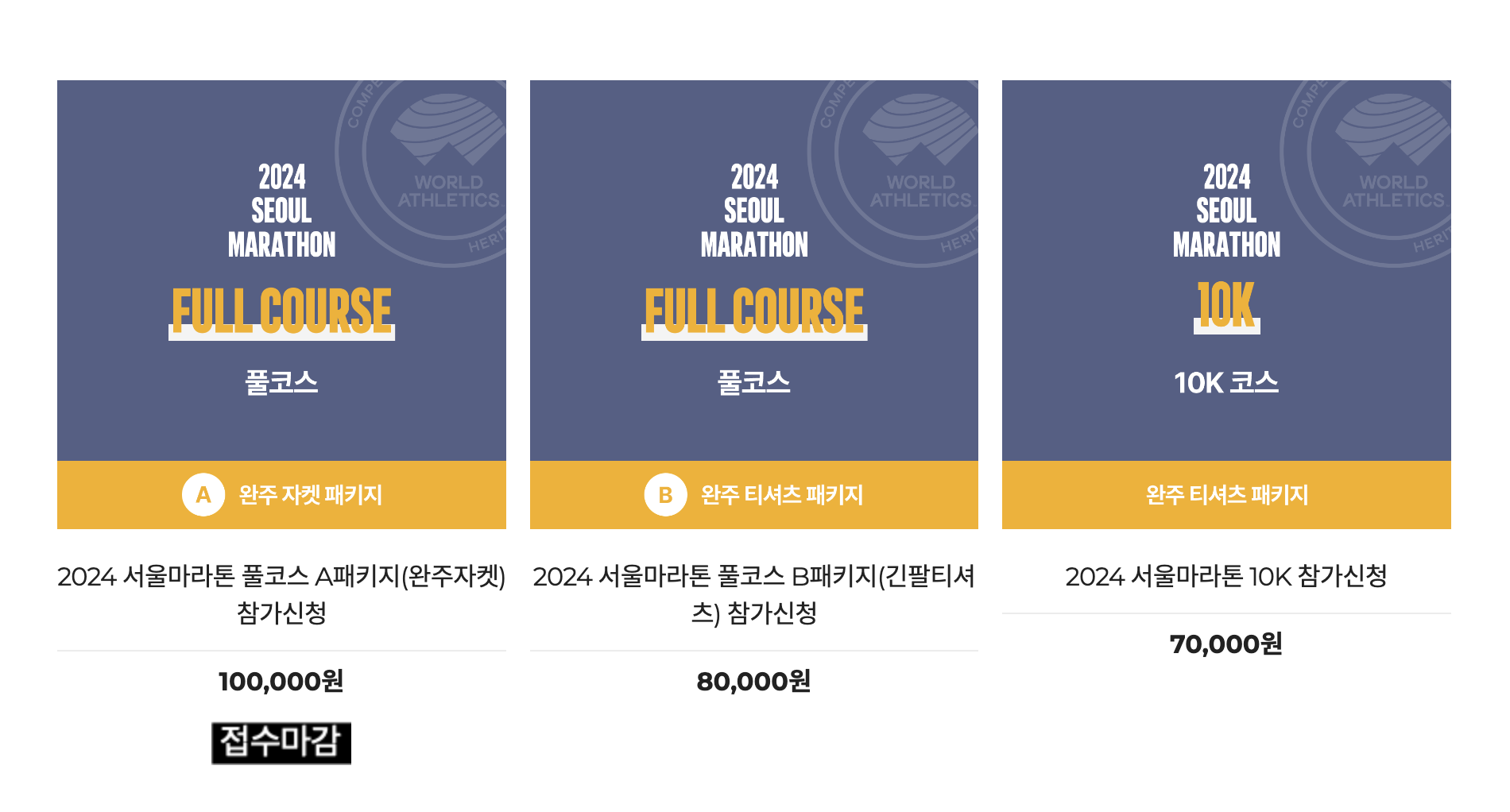 2024 서울마라톤 접수는 이렇게 3가지로 받았고 가장 먼저 완주 자켓 패키지가 마감되었습니다.