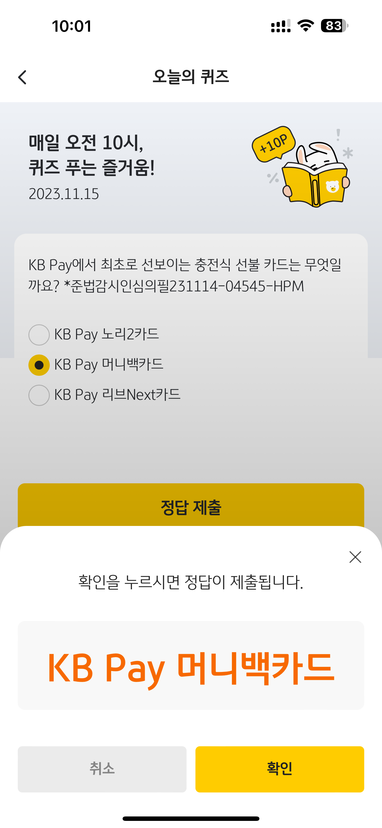 KB Pay 오늘의 퀴즈 정답은 KB Pay 머니백카드 입니다