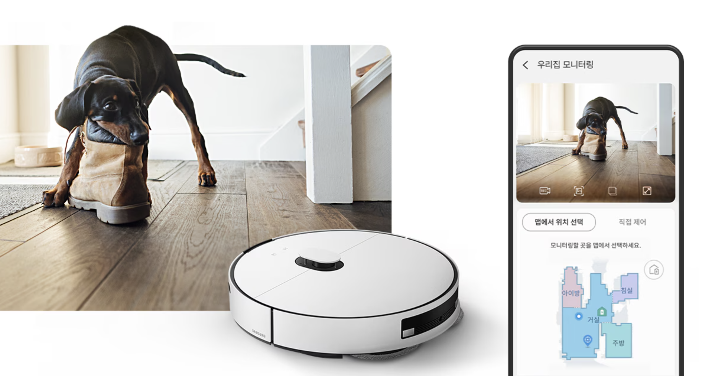 삼성 비스포크 AI 스팀 로봇청소기는 카메라를 통해 실시간으로 집안을 확인할 수 있게 지원합니다. 사진, 동영상을 촬영해 반려동물이 노는 모습, 집안의 보안 상태를 점검할 수 있습니다.