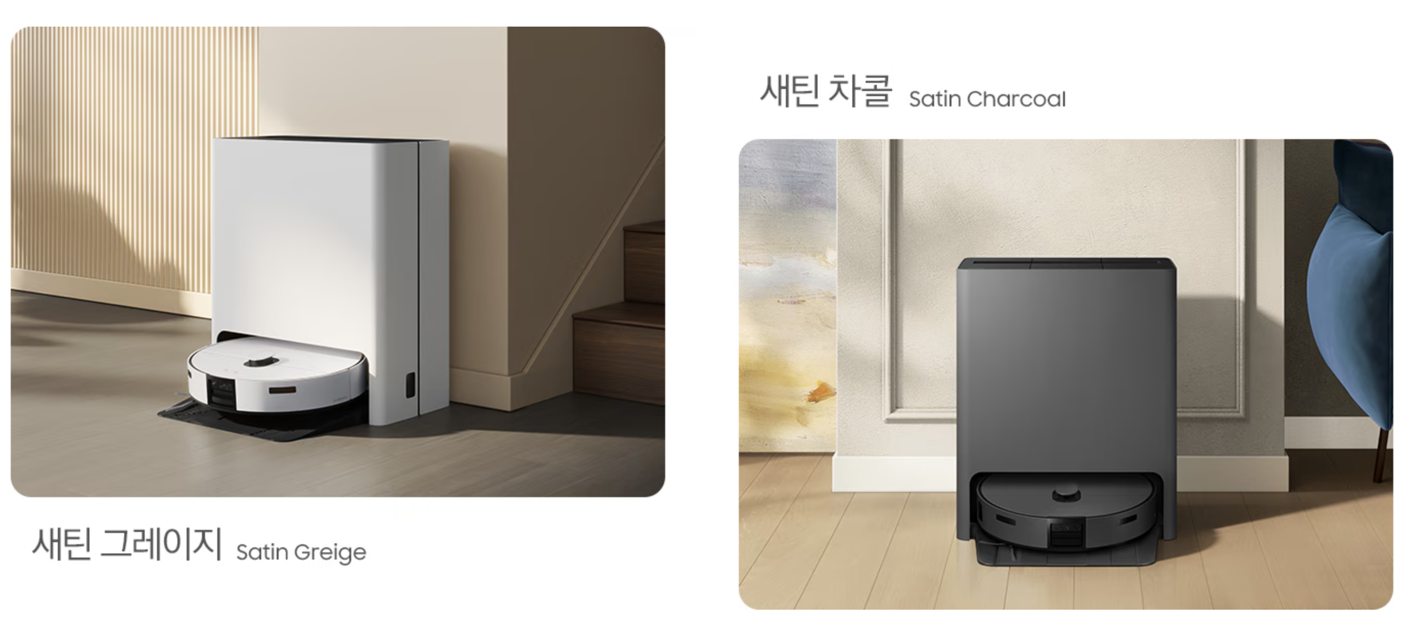 삼성 비스포크 AI 스팀 로봇청소기는 모던한 디자인으로 고급스러운 실내 인테리어 효과를 줄 수 있습니다. 색상은 밝은 새틴 그레이지 색상과 어두운 새틴 차콜이 있습니다.