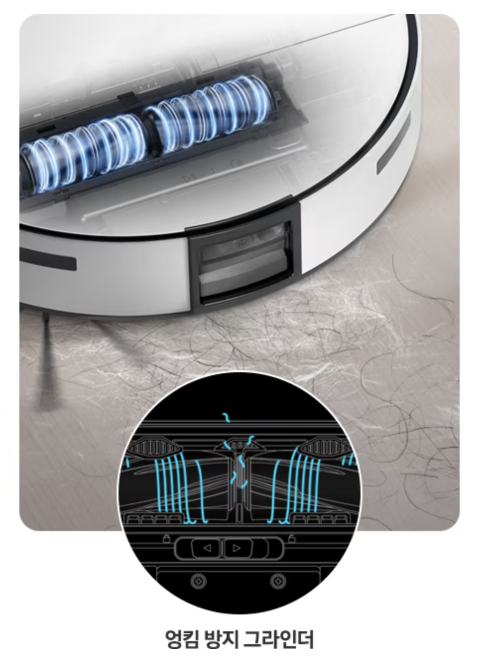삼성 비스포크 AI 스팀 로봇청소기는 모래시계 모양 구조의 엉킴 방지 브러시로 머리카락을 가운데로 모으고 그라인더로 잘라 엉킴 걱정을 줄여줍니다.