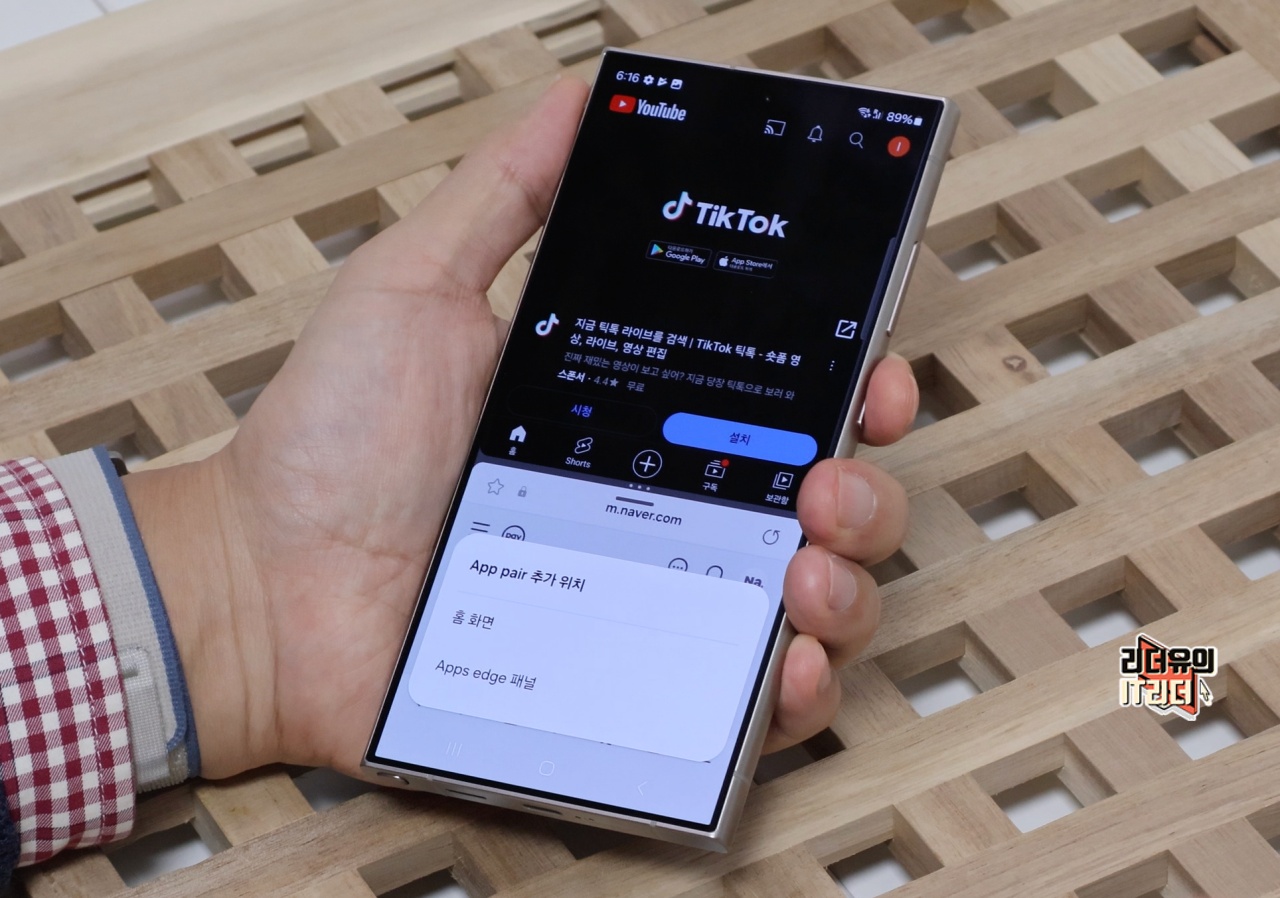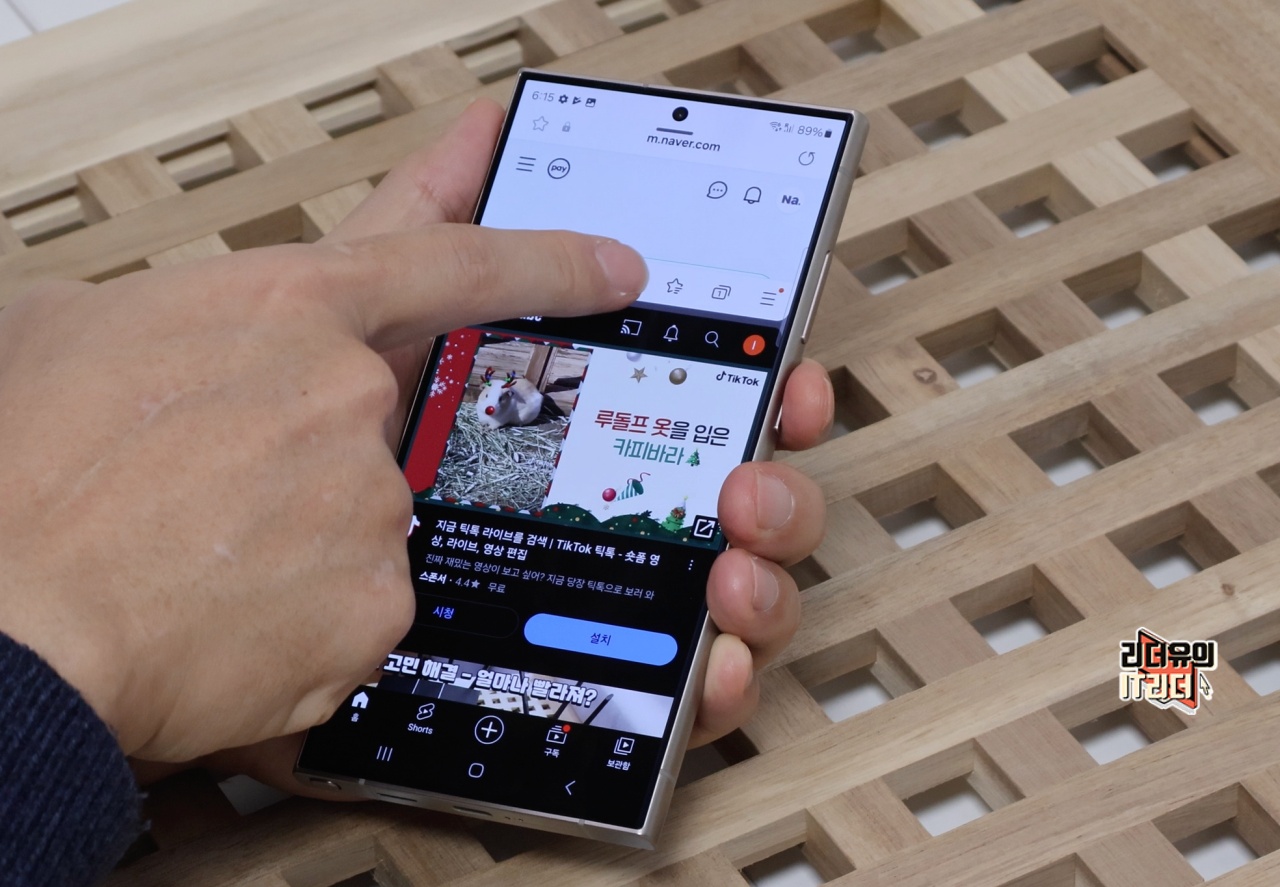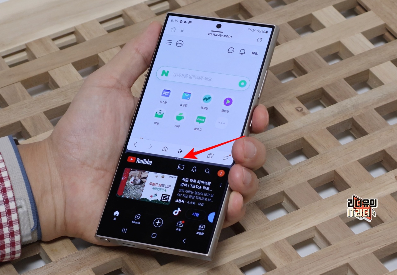 이제 삼성 갤럭시S24 울트라 화면분할이 되었습니다. 상단에는 인터넷, 하단에는 유튜브가 실행되고 있습니다.