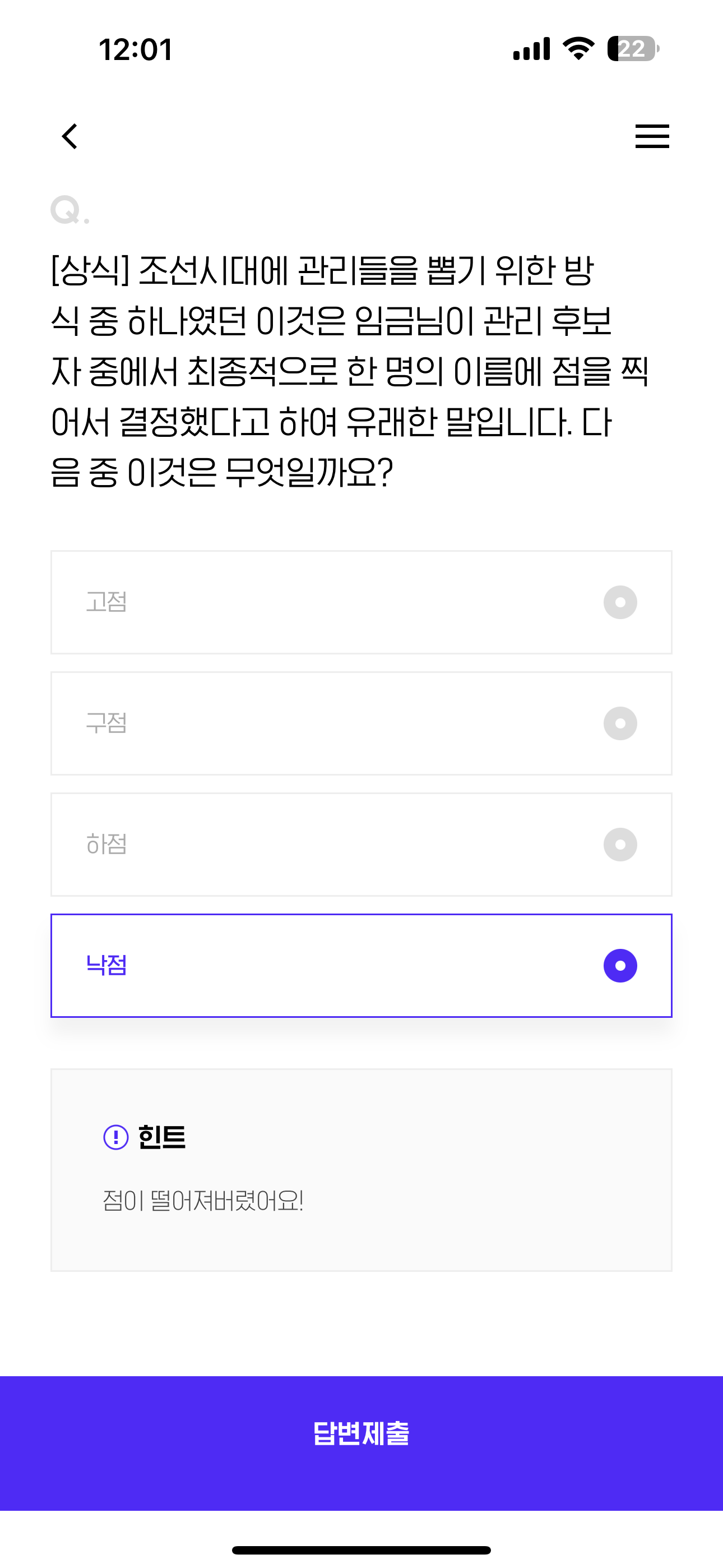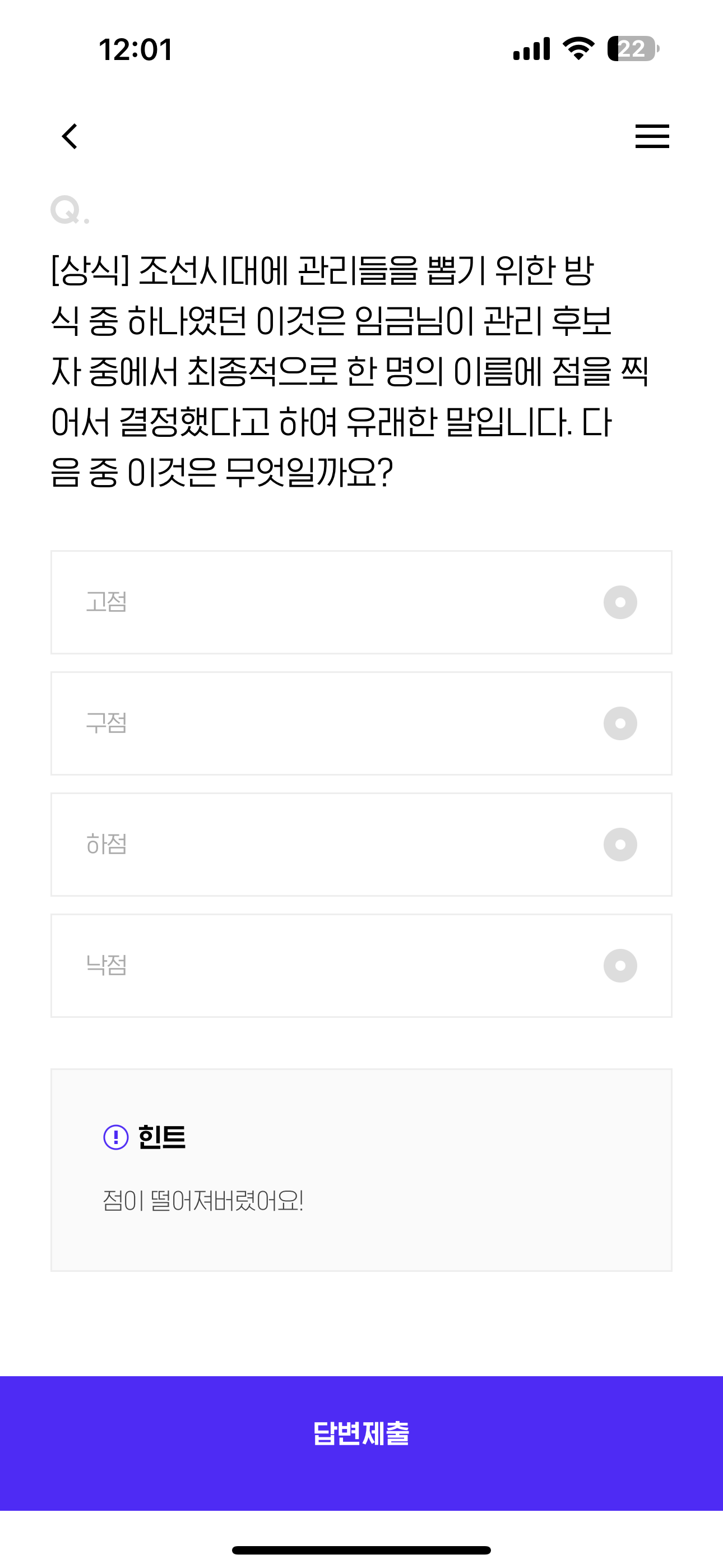 [상식] 조선시대에 관리들을 뽑기 위한 방식 중 하나였던 이것은 임금님이 관리 후보자 중에서 최종적으로 한 명의 이름에 점을 찍어서 결정했다고 하여 유래한 말입니다. 다음 중 이것은 무엇일까요? 보기는 1. 고점 2. 구점 3. 하점 4. 낙점 입니다.