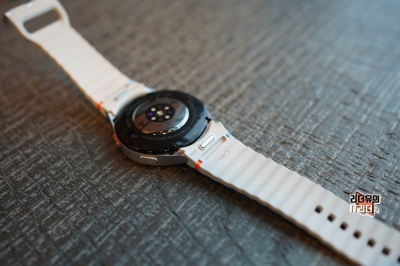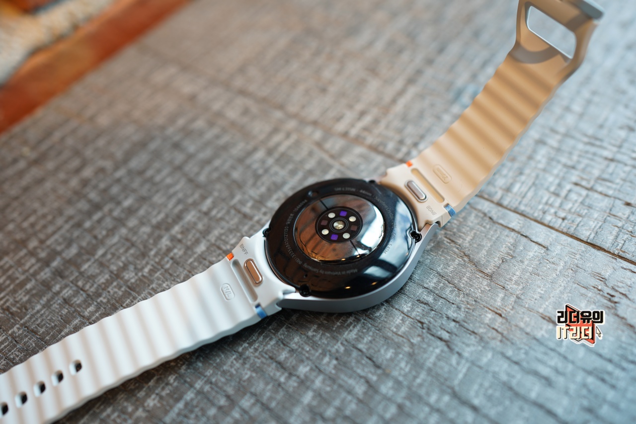 삼성 갤럭시워치7 안쪽면에는 새롭게 변경된 센서를 확인해 볼 수 있습니다.