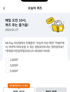 오늘의 퀴즈649 KB pay 오늘의 퀴즈 1월 19일 정답("여행엔 달러가 좋잖아요! 통크게 $100 쏩니다" 이벤트에서 $100 당첨 시 경품은 어떤 형태로 지급될까요? ) KB Pay 오늘의 퀴즈 1월 19일 문제입니다. "여행엔 달러가 좋잖아요! 통크게 $100 쏩니다" 이벤트에서 $100 당첨 시 경품은 어떤 형태로 지급될까요? *준법감시인심의필250114-00185-HMA 보기는 1. 계좌입금 2. 주소지로 우편발송 3. KB Pay 외화머니 적립 입니다. 여행시에 꼭 필요한 달러를 제공한다고 합니다. 참고해 보세요 KB Pay 오늘의 퀴즈 정답은 KB Pay 외화머니 적립 입니다 포인트는 현금 전환 가능하니 꼭 받으세요 쿠팡 파트너스 활동의 일환으로, 이에 따른 일정액의 수수료를 제공받습니다 IT리더 함께 보면 좋은 영상 [리더유 유튜브 구독 바로가기]- 리더유 유튜브 구독하시면 쉽게 IT를 배울 수 있습니다. 알림 체크도 해두시면 좋아요 2025. 1. 19. KB Pay 오늘의 퀴즈 1월 18일 정답(KB pay 최초 신규가입 고객이라면 누구나 받을 수 있는 첫만남 기념 선물은 무엇일까요?) KB Pay 오늘의 퀴즈 1월 18일 문제입니다 KB pay 최초 신규가입 고객이라면 누구나 받을 수 있는 첫만남 기념 선물은 무엇일까요? *준법감시인심의필 250116-00218-HMA 보기는 1. 메가MGC커피 아메리카노 2. 빽다방 아메리카노 3. 컴포즈커피 아메리카노 입니다. KB pay 아직 가입 안하신 분들은 커피를 받을 수 있으니 꼭 해보세요 KB Pay 오늘의 퀴즈 정답은 메가MGC커피 아메리카노 입니다 포인트는 현금 전환 가능하니 꼭 받으세요 쿠팡 파트너스 활동의 일환으로, 이에 따른 일정액의 수수료를 제공받습니다 IT리더 함께 보면 좋은 영상 [리더유 유튜브 구독 바로가기]- 리더유 유튜브 구독하시면 쉽게 IT를 배울 수 있습니다. 알림 체크도 해두시면 좋아요 2025. 1. 18. KB Pay 오늘의 퀴즈 1월 17일 정답(KB Pay 자산탭에서 진행중인 "오늘의 자산 확인" 이벤트에서, 하루에 최대 받을 수 있는 랜덤포인트리는 얼마일까요?) KB pay 오늘의 퀴즈 1월 17일 문제입니다 KB Pay 자산탭에서 진행중인 "오늘의 자산 확인" 이벤트에서, 하루에 최대 받을 수 있는 랜덤포인트리는 얼마일까요? *준법감시인심의필250114-00183-MOB 보기는 1. 1,000P 2. 3,000P 3. 5,000P 입니다. 자산탭에서 오늘의 자산 확인을 하면 포인트를 받을 수 있으니 참고해 두세요 KB Pay 오늘의 퀴즈 정답은 5,000P 입니다 포인트는 현금 전환 가능하니 꼭 받으세요 2025. 1. 17. KB Pay 오늘의 퀴즈 1월 10일 정답(KB Pay 여행의 KRAVELER 여행이야기에서 소개한 여행지가 아닌 곳은?) KB Pay 오늘의 퀴즈 1월 10일 문제입니다 KB Pay 여행의 KRAVELER 여행이야기에서 소개한 여행지가 아닌 곳은? *준법감시인심의필250107-00082-HMH 보기는 1. 일출 명소 울산 2. 고택 한옥 여행 순천 3. 서핑하면 양양 입니다. 정말 가볼만한 다양한 여행지들이 소개되고 있는데요. 어디로 여행갈까 고민하는 분들은 참고해 보세요 KB Pay 오늘의 퀴즈 정답은 서핑하면 양양 입니다 포인트는 현금 전환 가능하니 꼭 받으세요 2025. 1. 10. KB Pay 오늘의 퀴즈 1월 8일 정답(KB Pay 쇼핑 '쿡민데이'에서 지역을 대표하는 '맛'과 '장인정신'이 인정된 상품을 판매중입니다. 이것을 부르는 명칭은 무엇일까요?) KB Pay 오늘의 퀴즈 1월 8일 문제입니다 KB Pay 쇼핑 '쿡민데이'에서 지역을 대표하는 '맛'과 '장인정신'이 인정된 상품을 판매중입니다. 이것을 부르는 명칭은 무엇일까요? *준법감시인심의필250107-00064-HMA 보기는 1. 블루리본 2. 미슐랭 3. 백년가게 입니다. 지역을 대표하는 상품들이니 참고해 보세요 KB pay 오늘의 퀴즈 정답은 백년가게 입니다 포인트는 현금 전환 가능하니 꼭 받으세요쿠팡 파트너스 활동의 일환으로, 이에 따른 일정액의 수수료를 제공받습니다 IT리더 함께 보면 좋은 영상 [리더유 유튜브 구독 바로가기]- 리더유 유튜브 구독하시면 쉽게 IT를 배울 수 있습니다. 알림 체크도 해두시면 좋아요 2025. 1. 8. KB Pay 오늘의 퀴즈 1월 5일 정답([해피 윈터 이벤트 겨울맞이 선물 왔설] 이벤트의 경품을 받기 위한 조건이 아닌 것은?) KB pay 오늘의 퀴즈 1월 5일 문제입니다 [해피 윈터 이벤트 겨울맞이 선물 왔설] 이벤트의 경품을 받기 위한 조건이 아닌 것은? *준법감시인심의필 241226-06402-ETC 보기는 1. 응모하기 2. 신용카드 1만원 이상 결제 3. PUSH 동의 입니다. 새해를 맞아 다양한 경품이 걸린 이벤트가 진행되고 있습니다. 참고해서 응모하세요 KB Pay 오늘의 퀴즈 정답은 신용카드 1만원 이상 결제 입니다포인트는 현금 전환 가능하니 꼭 받으세요쿠팡 파트너스 활동의 일환으로, 이에 따른 일정액의 수수료를 제공받습니다 IT리더 함께 보면 좋은 영상 [리더유 유튜브 구독 바로가기]- 리더유 유튜브 구독하시면 쉽게 IT를 배울 수 있습니다. 알림 체크도 해두시면 좋아요 2025. 1. 5. 이전 1 2 3 4 5 6 7 ··· 109 다음
