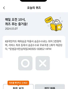 IT리더7820 나만의 닥터 퀴즈 12월 17일 정답(입술을 뜯거나 침을 자주 바르는 행위는 구순염을 악화시킬 수 있다) 나만의 닥터 퀴즈 12월 17일 문제입니다 입술을 뜯거나 침을 자주 바르는 행위는 구순염을 악화시킬 수 있다. 그렇다. 아니다 선택하면 되는데요. 구순염은 우리가 흔하게 걸리는 질병이죠. 구순염에 걸리면 빨리 치료를 해야 하는데요. 우리도 모르게 잘못된 습관으로 구순염을 악화시키고 있습니다. 잘 참고해서 관리해 보세요 나만의 닥터 퀴즈 정답은 그렇다 입니다 포인트박스는 기프티콘으로 변경 가능하니 꼭 받으세요 쿠팡 파트너스 활동의 일환으로, 이에 따른 일정액의 수수료를 제공받습니다 IT리더 함께 보면 좋은 영상 [리더유 유튜브 구독 바로가기]- 리더유 유튜브 구독하시면 쉽게 IT를 배울 수 있습니다. 알림 체크도 해두시면 좋아요 2024. 12. 17. 신한카드 퀴즈팡팡 12월 17일 정답(슈퍼SOL 출시 1주년 기념 이벤트에서 생일 축하 촛불을 끄고 받을 수 있는 최대 포인트는?) 신한카드 퀴즈팡팡 12월 17일 문제입니다 슈퍼SOL 출시 1주년 기념 이벤트에서 생일 축하 촛불을 끄고 받을 수 있는 최대 포인트는? 보기는 1. 100만 포인트 2. 500만 포인트 입니다. 슈퍼SOL 출시 1주년이 되었습니다. 파격적인 이벤트를 열고 있으니 참고해서 득템하세요! 행운이 함께 하길 바라겠습니다 신한카드 퀴즈팡팡 정답은 500만 포인트 입니다 포인트는 현금 전환 가능하니 꼭 받으세요 쿠팡 파트너스 활동의 일환으로, 이에 따른 일정액의 수수료를 제공받습니다 IT리더 함께 보면 좋은 영상 [리더유 유튜브 구독 바로가기]- 리더유 유튜브 구독하시면 쉽게 IT를 배울 수 있습니다. 알림 체크도 해두시면 좋아요 2024. 12. 17. H포인트 퀴즈 12월 17일 정답(다음 중 서울 성수동에서 12월 18일까지 만나볼 수 있는, 토템의 몰입형 팝업의 테마는 무엇일까요?) H포인트 퀴즈 12월 17일 문제입니다 다음 중 서울 성수동에서 12월 18일까지 만나볼 수 있는, 토템의 몰입형 팝업의 테마는 무엇일까요? 보기는 1. 유형 2. 무 3. 원형 4. 균형 입니다. 완성되지 않은 본질과 가까운 형태를 뜻하며, 이로부터 영감을 받아 팝업의 전반적 공간을 한국의 전통적 소재인 한지로 수제 제작하여 임시적인 특성을 생생히 표현했습니다 H포인트 퀴즈 정답은 원형 입니다 포인트는 현금 전환 가능하니 꼭 받으세요 쿠팡 파트너스 활동의 일환으로, 이에 따른 일정액의 수수료를 제공받습니다 IT리더 함께 보면 좋은 영상 [리더유 유튜브 구독 바로가기]- 리더유 유튜브 구독하시면 쉽게 IT를 배울 수 있습니다. 알림 체크도 해두시면 좋아요 2024. 12. 17. 신한 슈퍼SOL 야구/상식 쏠퀴즈 12월 17일 정답(12월 13일, 최대 14억원의 FA계약을 통해 두산베어스에서 LG트윈스로 이적한 투수는 누구일까요? ) 신한 슈퍼SOL 야구/상식 쏠퀴즈 12월 17일 문제입니다 12월 13일, 최대 14억원의 FA계약을 통해 두산베어스에서 LG트윈스로 이적한 투수는 누구일까요? 보기는 1. 김강률 2. 유희관 3. 곽빈 4. 홍건희 입니다. 프로야구 시즌이 끝났고 각팀은 전략 강화를 위해 대어들과 FA 계약을 체결하고 있습니다. 최대 14억원이라는 놀라운 가격으로 LG트윈스의 선수가 되었습니다. 신한 슈퍼SOL 야구/상식 쏠퀴즈 정답은 김강률 입니다 포인트는 현금 전환 가능하니 꼭 받으세요쿠팡 파트너스 활동의 일환으로, 이에 따른 일정액의 수수료를 제공받습니다 IT리더 함께 보면 좋은 영상 [리더유 유튜브 구독 바로가기]- 리더유 유튜브 구독하시면 쉽게 IT를 배울 수 있습니다. 알림 체크도 해두시면 좋아요 2024. 12. 17. 비트버니 오늘의 퀴즈 12월 17일 ㅇㅈㅅ정답(OOO 증명이란 자신이 알고 있는 지식이나 정보 등을 상대방에게 공개하지 않고도 자신이 그 내용을 알고 있다는 것을 증명할 수 있는 방법으로) 비트버니 오늘의 퀴즈 12월 17일 문제입니다 OOO 증명이란 자신이 알고 있는 지식이나 정보 등을 상대방에게 공개하지 않고도 자신이 그 내용을 알고 있다는 것을 증명할 수 있는 방법으로, 최근 많은 블록체인 프로젝트의 근간 기술로 활용되고 있어요. 주관식 퀴즈인데요. 자신을 나타내지 않고도 그 내용을 알고 있다? 뭘까요? 비트버니 오늘의 퀴즈 초성 힌트는 ㅇㅈㅅ 입니다 비트버니 오늘의 퀴즈 정답은 영지식 입니다 코인은 기프티콘으로 변경 가능하니 꼭 받으세요 쿠팡 파트너스 활동의 일환으로, 이에 따른 일정액의 수수료를 제공받습니다 IT리더 함께 보면 좋은 영상 [리더유 유튜브 구독 바로가기]- 리더유 유튜브 구독하시면 쉽게 IT를 배울 수 있습니다. 알림 체크도 해두시면 좋아요 2024. 12. 17. KB스타뱅킹 스타퀴즈 12월 17일 정답(한 손에는 커피를, 다른 한 손에는 유모차 손잡이를 잡은 아빠를 가리키는 말로 육아에 적극적으로 나서는 아빠를 의미하는 말은 무엇일까요?) KB스타뱅킹 스타퀴즈 12월 17일 문제입니다 한 손에는 커피를, 다른 한 손에는 유모차 손잡이를 잡은 아빠를 가리키는 말로 육아에 적극적으로 나서는 아빠를 의미하는 말은 무엇일까요? 보기는 1. 커피 러버 2. 얼죽 아빠 3 . 라떼 파파파 4. 아따 맘마 입니다. 요즘은 아빠들도 육아에 진심인 분들 많죠. 어쩌면 여성보다 